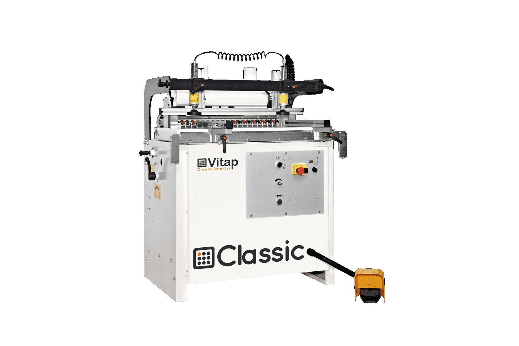 Dowel hole drilling machine Brand: VITAP Type: ALFA 21 CLASSIC New machine - One boring unit 21 spindles - QUICK CHANGE SPINDLES - Pneumatic cylinder for horizontal/vertical positioning of the boring group (45 degreed and any intermediate angles) - Front/top caliper to obtain the same boring measure between horizontal and vertical position - Tilting side stops adjustable by metric scale and nonius and magnifying lens on each stop - 2 safety clamps inclined 4 degrees - Height regulation of the boring group by mechanical digital position indicator; - 6 positions turret to adjust the drilling depth (0-80 mm) - Automatic vertical-horizontal depth difference device (10 mms) - Drilling speed adjustment from the panel control - Strengthened steel structures for tilting of the boring group - 1 motor HP. 2 (Kw 1,50) - Start/stop electropneumatic circuit by mean ...