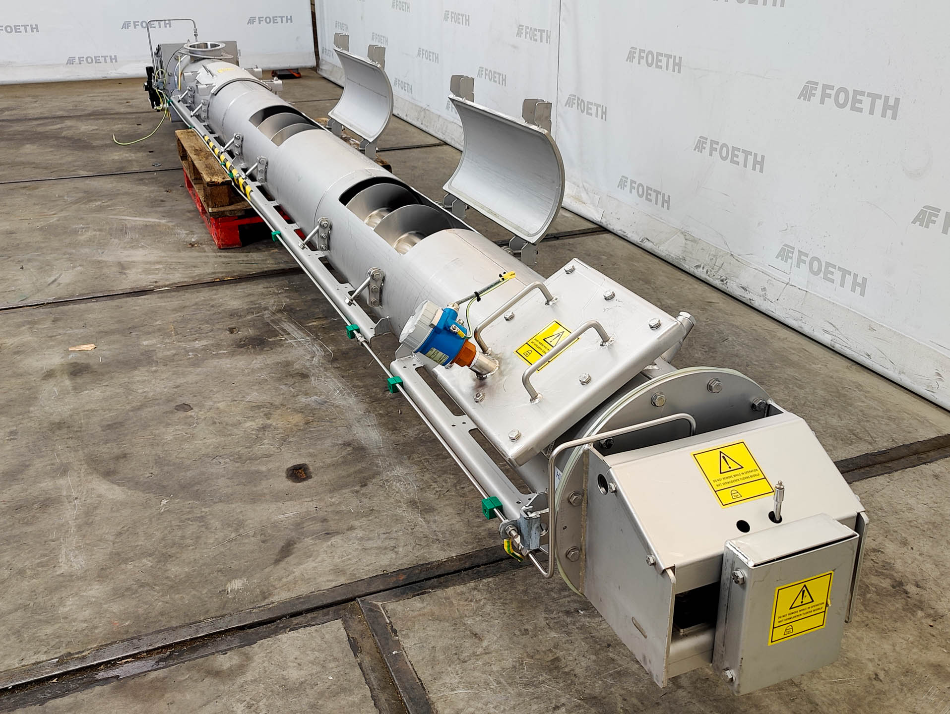 General SKU239T285 MakeGuttridge Mach.No.0580194-1-1 Year of construction2013 Main Features Motor18.5 KW Length6500 mm Inlet diameter390 mm Specified Features - Horizontal screw conveyor MaterialStainless steel Horizontal conveyor screwcheck Trough-typecheck Diameter720 mm Length6500 mm Between inlet and outlet5850 mm Shaft diameterdia. 200 mm Pitch500 mm Inletdia. 390 mm Outlet530x420 mm Motor18,5 kW Screw speed33 rpm Height between in- and outlet1500 mm With coverscheck Information LocationBarneveld Floorspace7,5x1,8 m Total height1,5 m Weight2800 kg CEcheck Technical specs Extra informationScrew blade thickness 6 mmTea, herbs & coffeeFine chemicalsStarchOther chemicalRubberBiotechnologyHorizontal screw conveyorsAgrochemicalsSpicesPlastic & polymersCatalysts & fillersFeed additivesPaper & otherSolventsDetergent & surf.Other pharmaceuticsCosmeticsOrganics ...