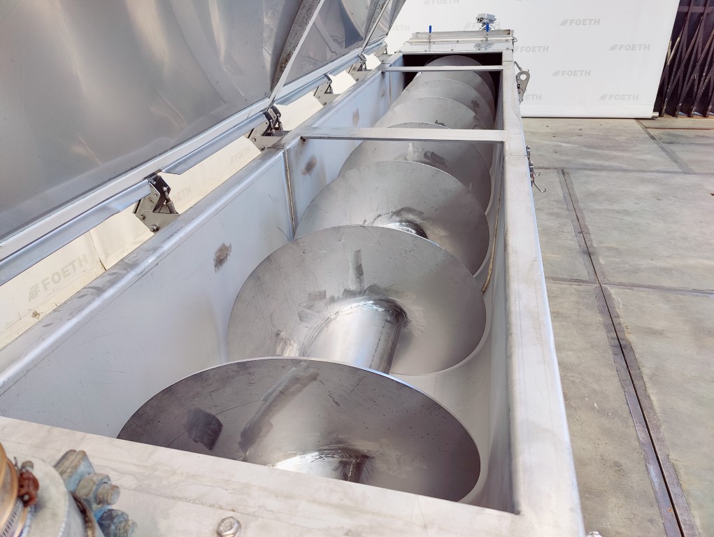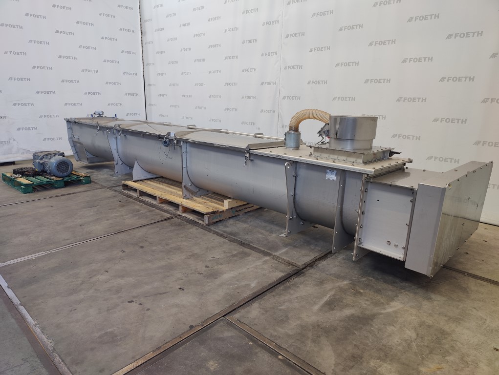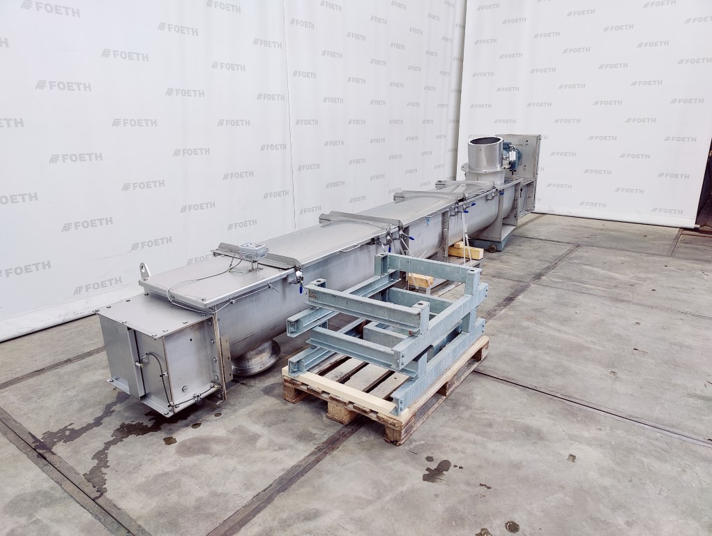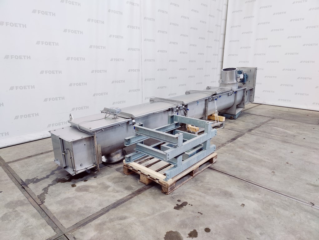 General SKU235U235 LocationBarneveld CEcheck MakeIlchmann Main Features Motor3 KW Length6525 mm Inlet diameter350 mm Specified Features - Horizontal screw conveyor Horizontal conveyor screwcheck Trough-typecheck Double shaftcheck Diameter200 mm (2x) Length6525 mm Between inlet and outlet5880 mm Shaft diameter108 mm (x) Pitch200 mm Inlet630x350 mm Outlet350x350 mm Max. temperature90 °C With adjustable packing glandscheck Motor3 kW, 220-230 volt / 380-400 volt, 1456 rpm Screw speed31 rpm With coverscheck MaterialStainless steel 1.4571 (316Ti) Information TypeDTSF 2x200x6.525 Mach.No.CRO 0348 Year of construction2014 Floorspace8,3x5,1 m Total height0,49 m Weight1250 kg Extra SpecificationsCapacity: max. 5 m³/hTea, herbs & coffeeFine chemicalsStarchOther chemicalRubberBiotechnologyHorizontal screw conveyorsAgrochemicalsSpicesPlastic & polymersCatalysts & f ...