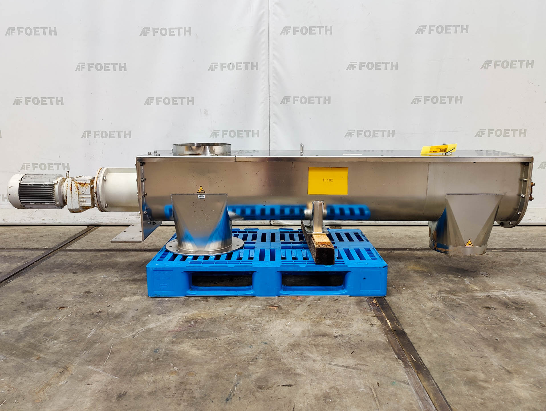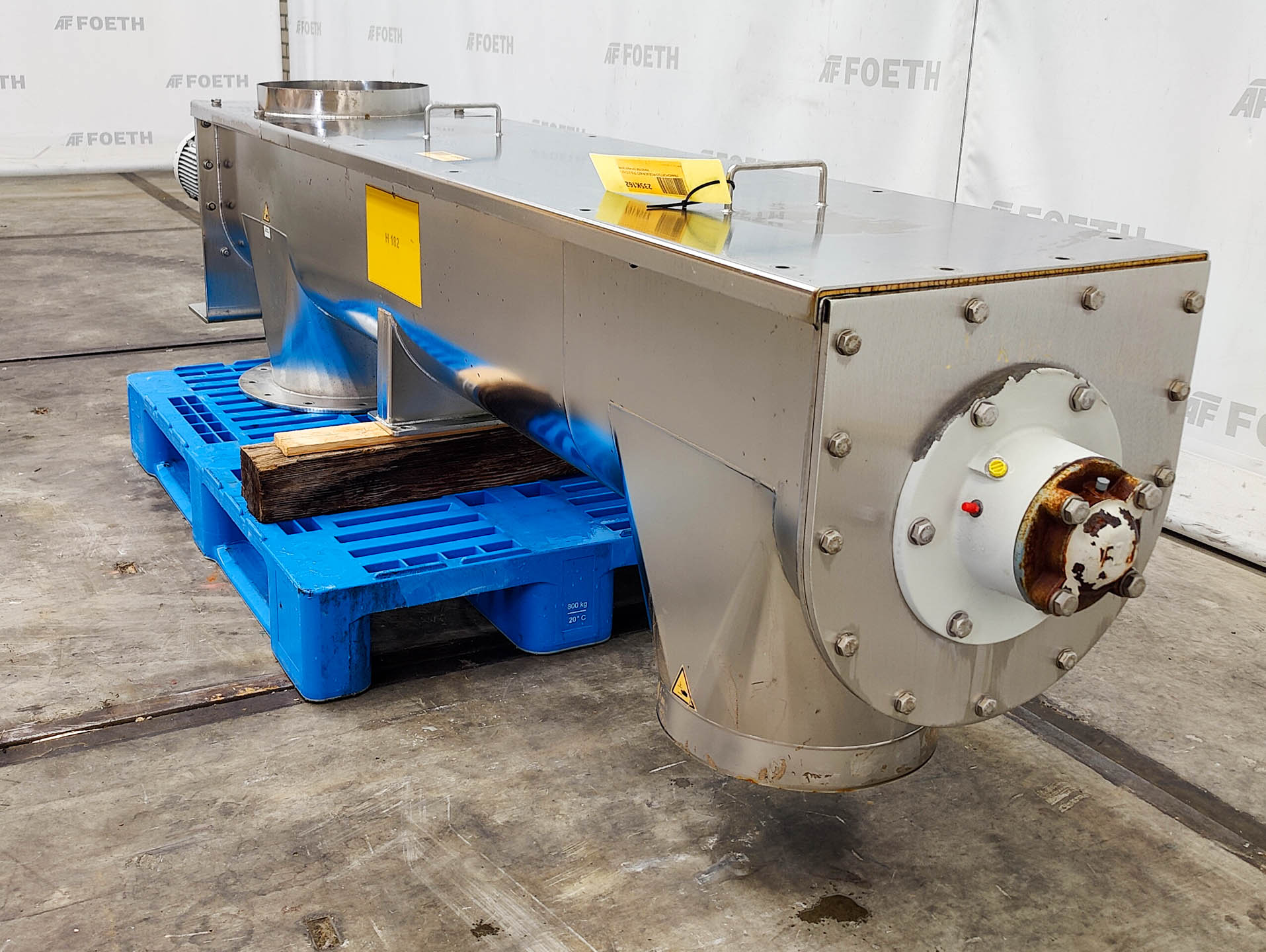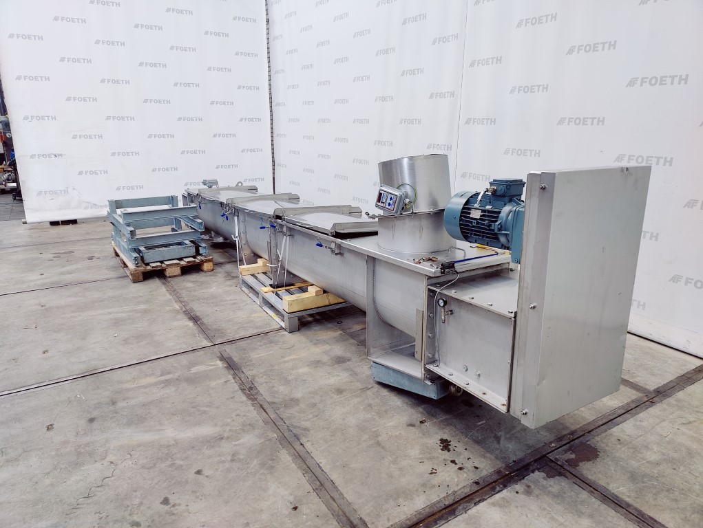 General SKU305U627 MakeStarick Fördertechnik GmbH TypeRFS-200/SoK Mach.No.1821.2694.01.05 Year of construction2005 Main Features Motor4 KW Length9520 mm Inlet diameter200 mm Specified Features - Horizontal screw conveyor MaterialStainless steel 1.4301 (304) Horizontal conveyor screwcheck Trough-typecheck Diameter219 mm Length9520 mm Between inlet and outlet7878 mm Shaft diameter133 mm Pitch185 mm InletDN200 OutletDN200 With jacketcheck (cooling) 6000mm long Max. temperature100°C With adjustable packing glandscheck Motor4kW, 400/690 Volt, 1452rpm Screw speed12/25 rpm Information LocationBarneveld Floorspace9.0x0,5 m Total height0,5 m Weight900 kg CEcheck ATEX compatiblecheck Extra Specificationswith new motor and gearboxTea, herbs & coffeeFine chemicalsStarchOther chemicalRubberBiotechnologyHorizontal screw conveyorsAgrochemicalsSpicesPlastic & polymers ...
