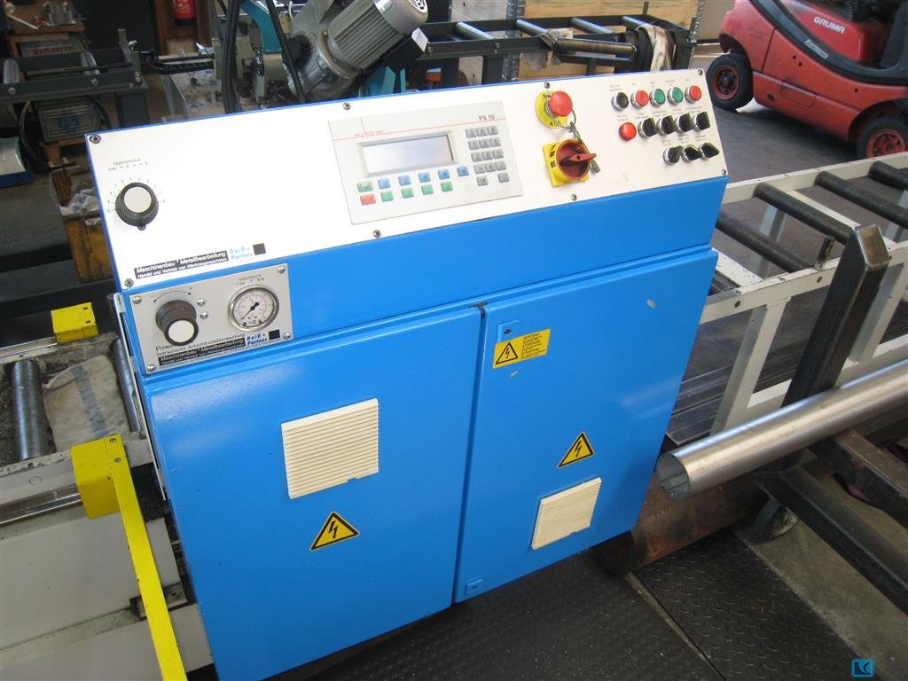 Serial Number: 44650046 Blade length: 4570 mm Cutting Capacity: Round material: ⌀ 406 mm Square Material: Width: 400 mm Height: 400 mm Max. loading capacity: Machine: 2500 kg Roller conveyor: 2000 kg/m Min. workpiece remaining length to ensure the clamping edge of 10 mm: 76 mm Min. workpiece residual length for no workpiece detection: 30 mm Saw blade dimensions: 41 x 1.3 x 4570 mm Velocities: 15 to 90 m per minute (50 Hz) 17 to 90 m per minute (60 Hz) Section length: 10 - 5040 mm (possible in steps of 0.1 mm) Single feed: 570 mm With technical documentation as shown in the pictures With additional roller conveyor Support length: approx. 2000 mm Total support length: approx. 5040 mm Auction-ID: A7-45758-40