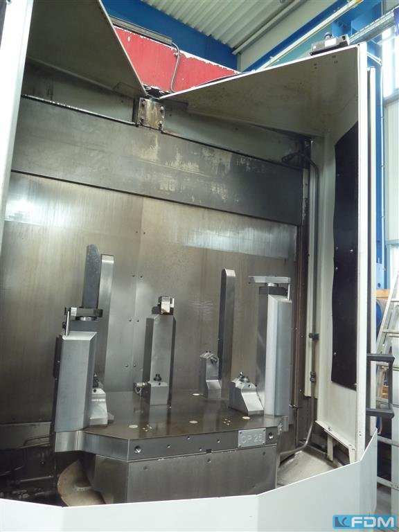 Maximale afmetingen van het werkstuk: 800 x 1000 mm tabelindexering elke 0,001° afstand van palletcentrum tot spindelneus: 70 gt; 810 mm afstand van palletoppervlak tot spindelcentrum: 100 gt; 830 mm Hogedrukkoeling via de spindel (70 bar) Uitgerust met Palletech High Rise System = uitbreidbare palletopslag met 2 niveaus voor 12 pallets. spanentransporteur X-axes: 730 mm Y-axes: 730 mm Z-axes: 740 mm Table dimensions: 500 x 500 mm (2x) Max weight on the table: 700 kg Admission in spindle (ISO): BT40 Power on the spindle: 30 kW Toolstore: yes Tools: 160 positions Frequency : 18000 rpm Number of pallets : 12 pallets Length: 9000 mm Depth: 8000 mm Height: 2850 mm Weight: 12,4 ton
