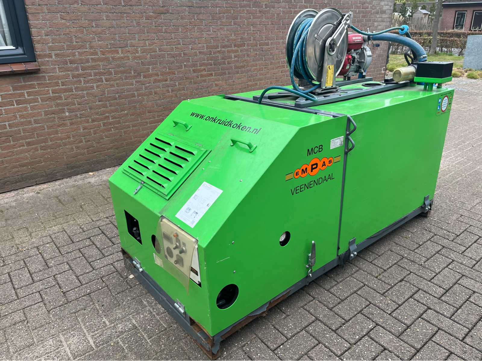 Empas MCB 1000 – in good condition Only 771 working hours Hot water up to max. 108°C Maximum pressure: 150 bar Water output: 12 litres/min Equipped with water softening system (liquid and electronic) 1000 litre storage tank Fill/Feed Pump: Honda, 620 litres/min Electric start Auction-ID: A1-40134-71