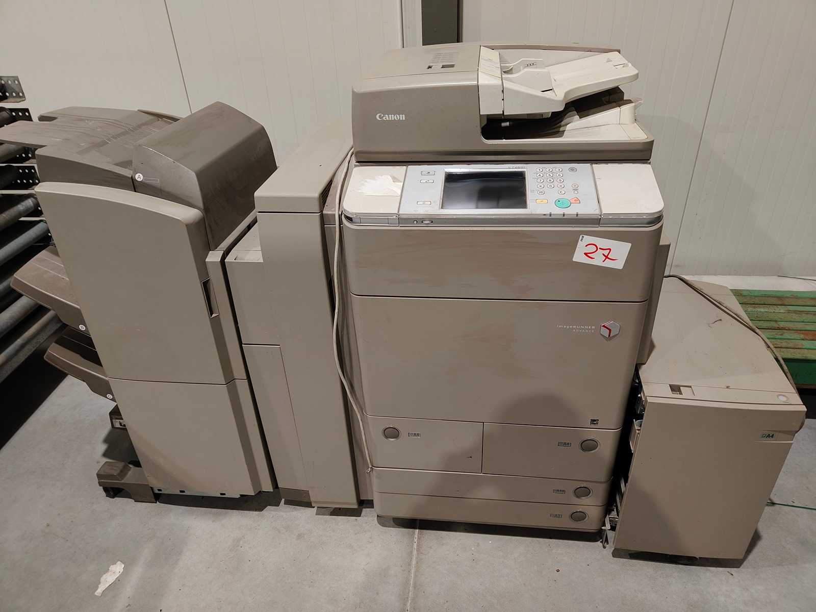 S. No.: UMF00631 Speed: prints Up to 70 p / m. Counter: Print Total: 1‘618‘150 Equipment / Additional information: - Envelope printing - Stapling - 2 or 4 hole punching - Folding - Three-knife trimmer - Scanning Printing method: color laser printing Print resolution: 2,400 x 2,400 dpi Max. Paper capacity: 7,650 sheets (A4 / A3) Max. Output capacity: 11,200 sheets (A4, 80 g / m²) Possible formats: Paper cassettes 1, 2 and 3: Standard formats: A4, A4R, A5R, A3, SRA3, maximum 330 x 483 mm Multi-purpose tray: Standard formats: A4, A4R, A5R, A3, SRA3, maximum 330 x 483 mm Envelopes: No.10 (COM10), Monarch, ISO-C5, DL Possible grammages: Standard cassettes: 52 to 220 g / m² Multi Purpose Tray / Optional Paper Trays: 52 to 300 g / m² Double-sided printing: 52 to 300 g / m² 2 complete sets of toners THE FOLLOWING NEW & ORIGINAL CANON TONER CARTRIDGES ARE AVAILAB ...