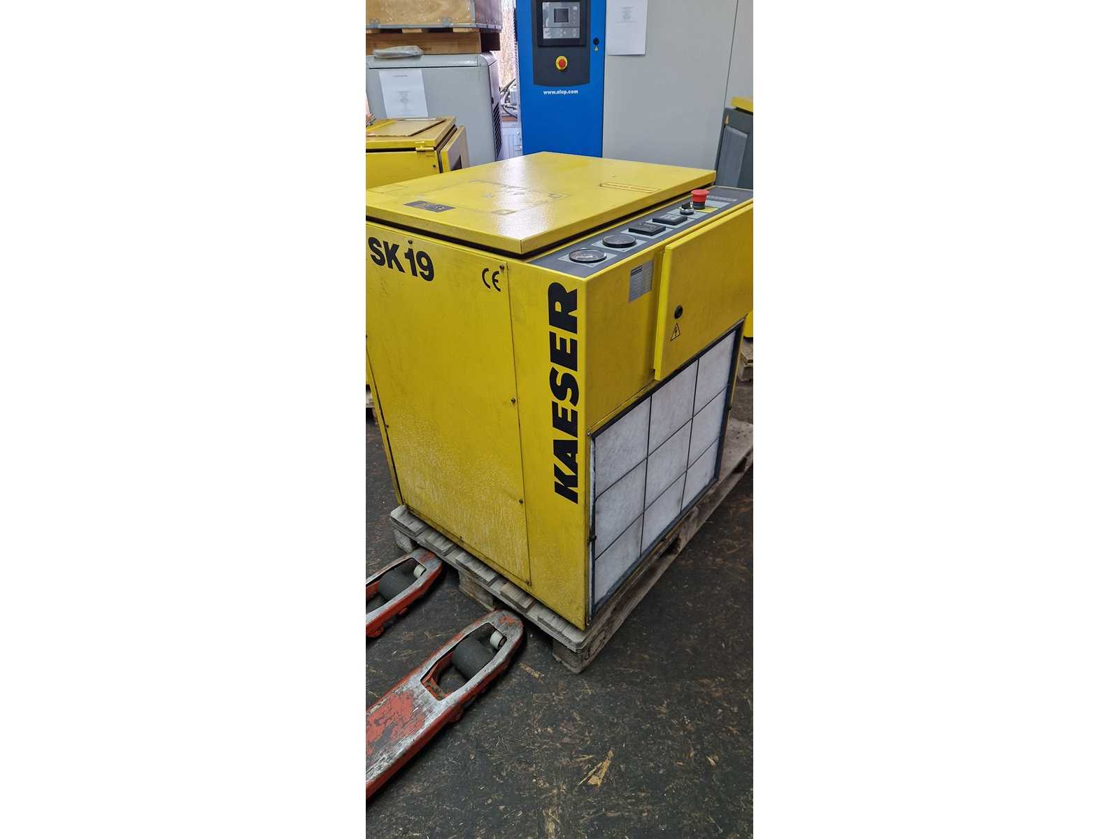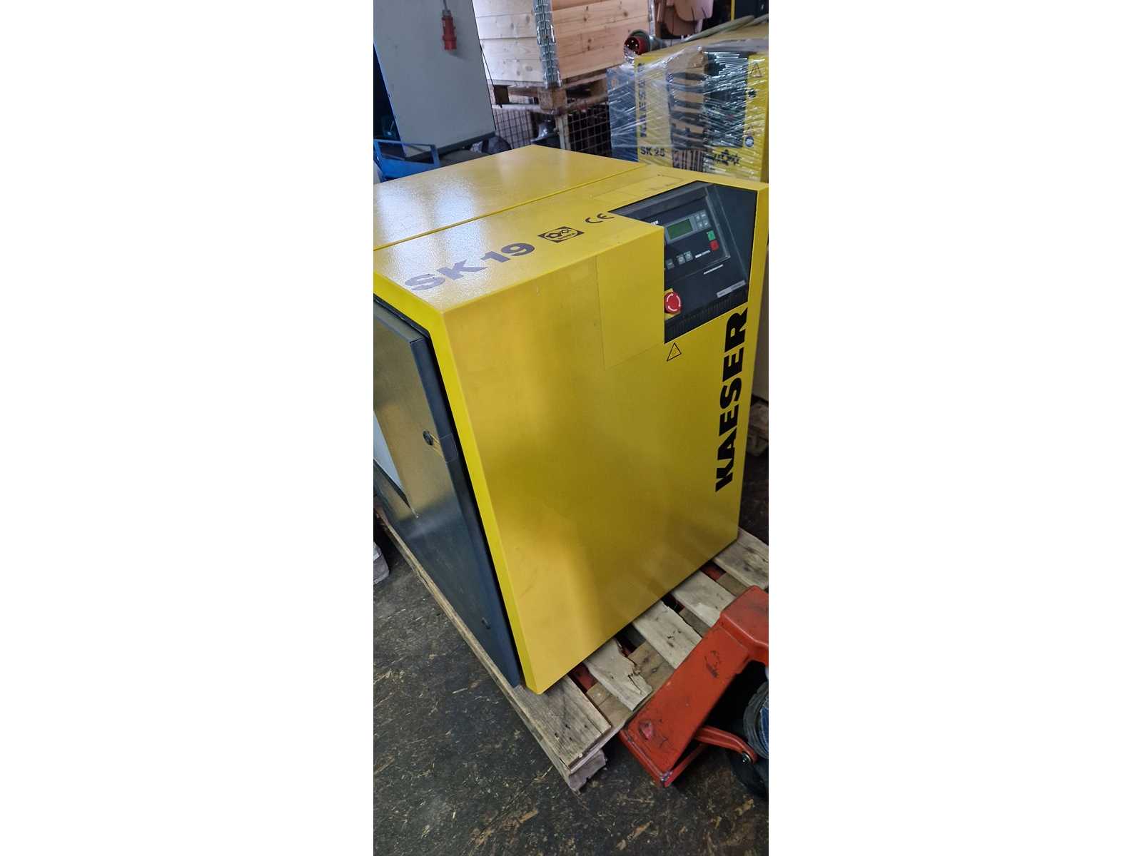 Screw compressor Kaeser SK 19 Manufacturer: Kaeser Type SK 19 Machine number 1017 Built in 1999 max. pressure 10 bar Power consumption 11 kW Delivery volume 1,590 l/min Operating hours 40,914 B/h Test run carried out lxwxh 84x78x101 cm Weight 270 kg Loading costs 50.00 Euro Auction-ID: 04J-7Y0-1