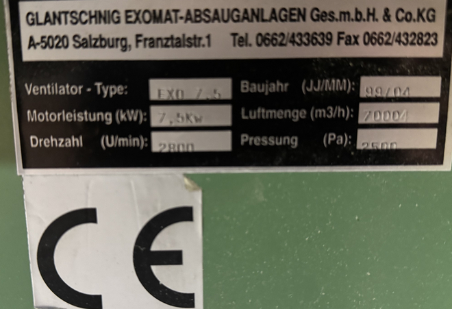 Suction wall with exhaust air unit, supply air unit, supply air filter, hot water heating register Suction wall: Make : Krautzberger, built 1992 Dimensions: 2.2 x 3.0 x 0.8 m (approx. BxHxT) Fan: 9,240 m3/h suction power, 2 kW Ex Supply air filter, supply fan, WW heater register: Make : Wolf, built 1999 Fan: 10,000 m3/h suction power, 9 kW Heater: 56 kW, 120 degrees C, 3,500 m3/h Pipeline : supply and exhaust air ducts, deflector hood We also have complete painting booths, drying booths and spare parts for painting systems in stock, e.g. Aggregates, lights, filter ceilings, entrance gates, roller doors, gratings, air ducts, etc. Please ask.