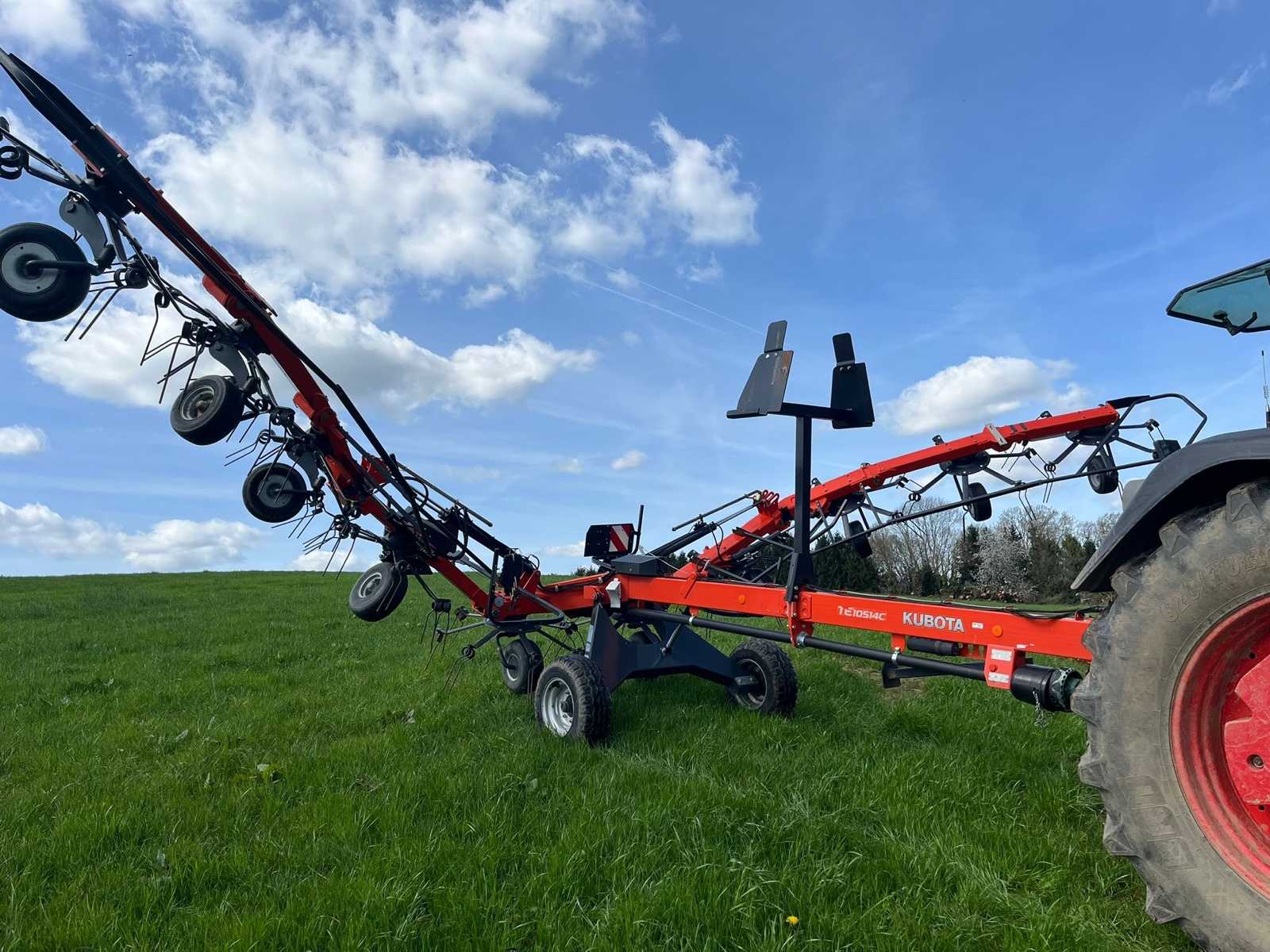 Kubota rotor heuer TE10514C with a working width of 13.5 m and a total of 10 rotors. The machine is in very good condition, both visually and technically, and is ready for immediate use. Particularly noteworthy is the integrated border spreading device: The outer approx. 3 metres can be swivelled inwards, which enables clean work at the edges of fields (see pictures). Auction-ID: 04J-BLB-1