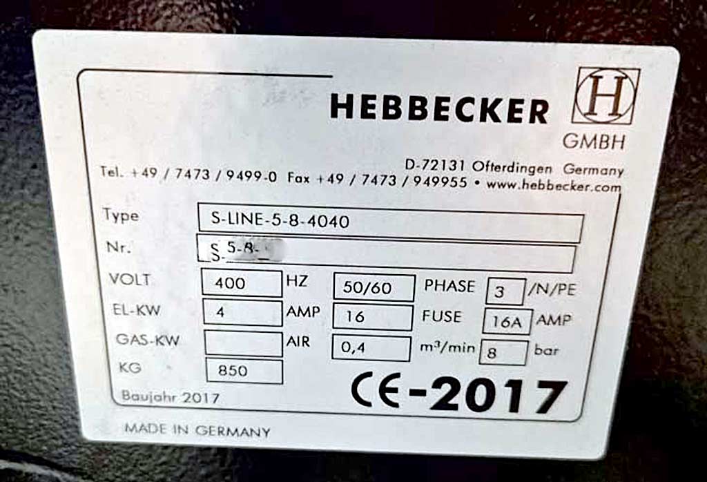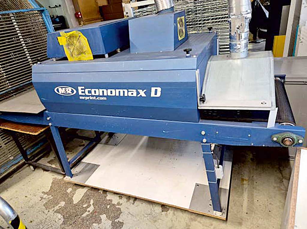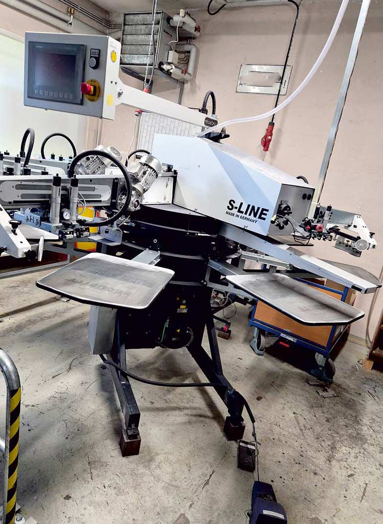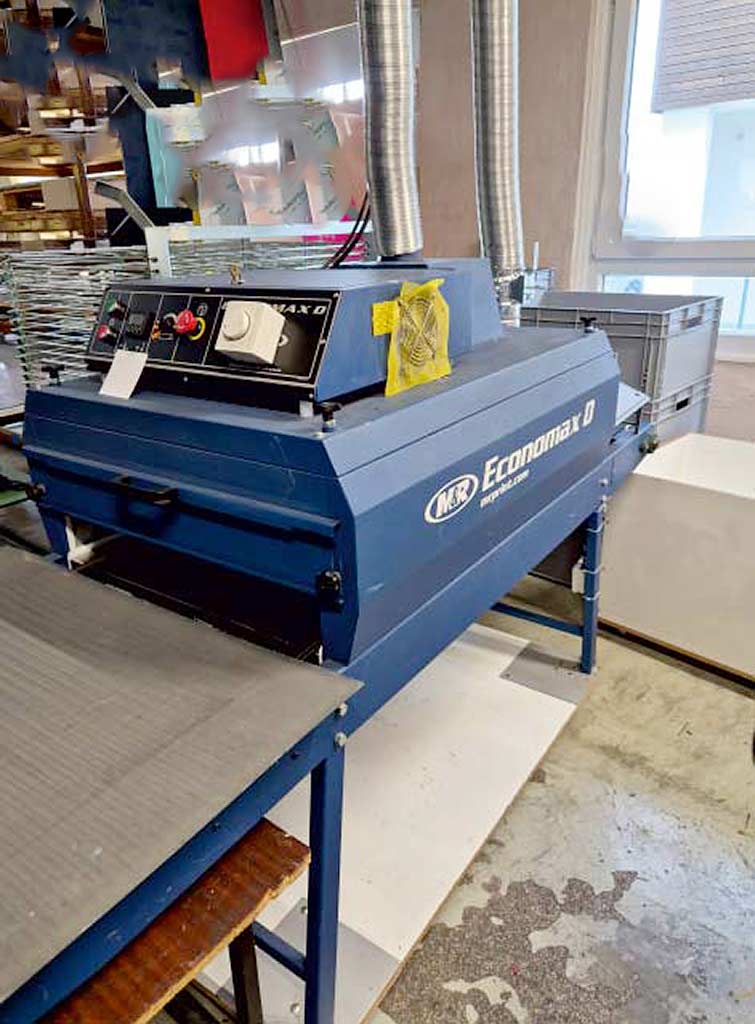 A textile screen printing machine Hebbecker including intermediate dryer and drying tunnel for the complete process is available. 1) Textile carousel screen printing machine Hebbecker S-Line-5-8-4040, year of manufacture: 2017, printing units: 5, stations: 8, max. print dimensions X/Y: 400mm/400mm, plate adjustment: +/-80mm, squeegee length: 410mm, machine diameter: approx. 2900mm, machine height: approx. 1900mm. 2) Infrared conveyor dryer M&R Economax D, year of manufacture: 2017, belt width: 610mm, heating chamber length: 1140mm, cooling system: CoolSkin. 3) Intermediate dryer Hebbecker Magic 25, year of manufacture: 2017. Documentation available. An on-site inspection is possible.