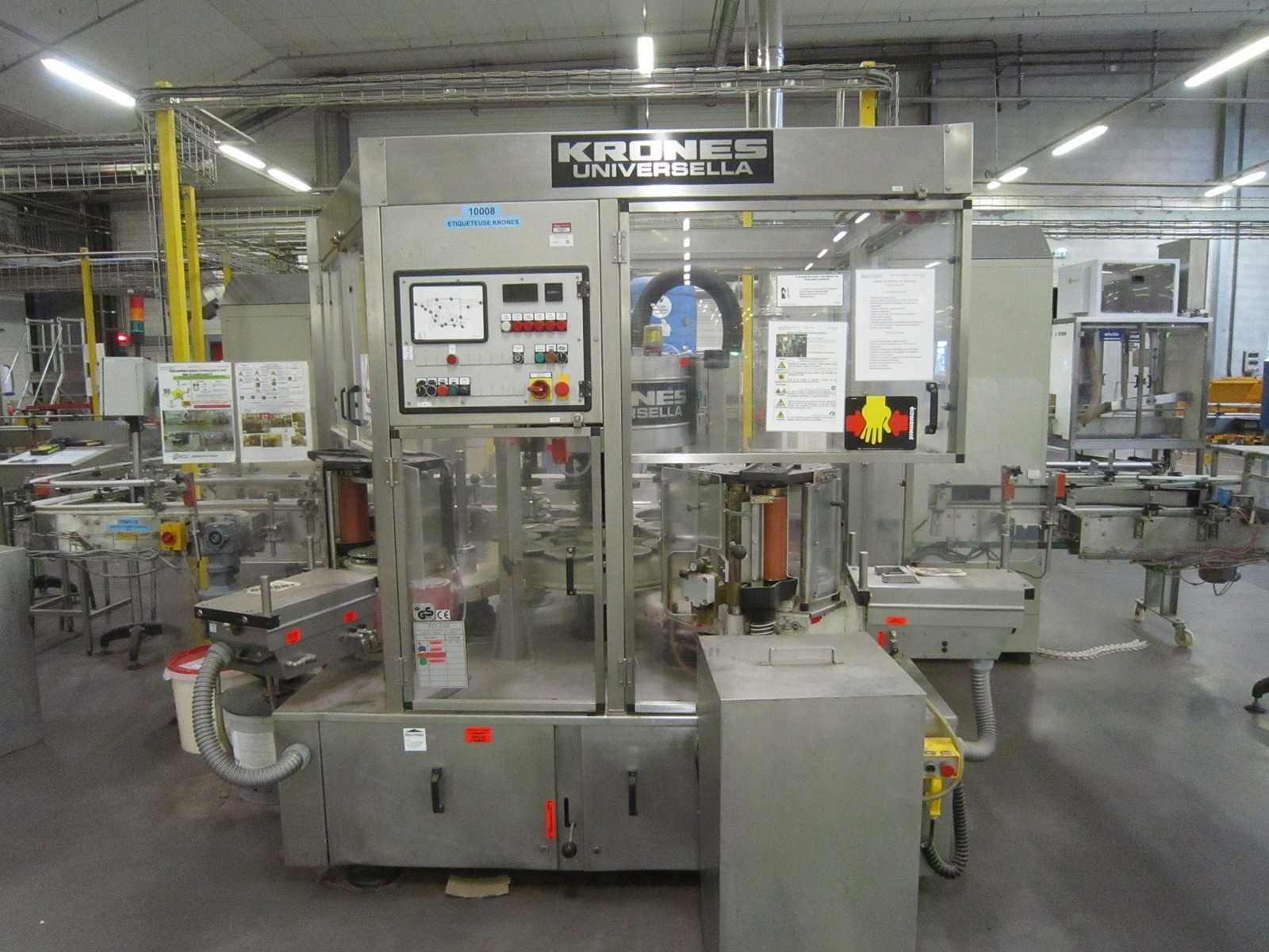 A cold glue labeling machine by Krones is available. Concept: rotary type, label type: cut paper labels, max. label width: 180mm, labeling capacity: approx. 6000 bottles/h, machine dimensions X/Y: approx. 3000mm/3000mm, weight: approx. 3500kg. Documentation available. On-site inspection possible.