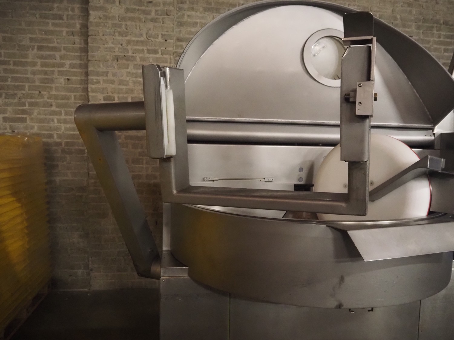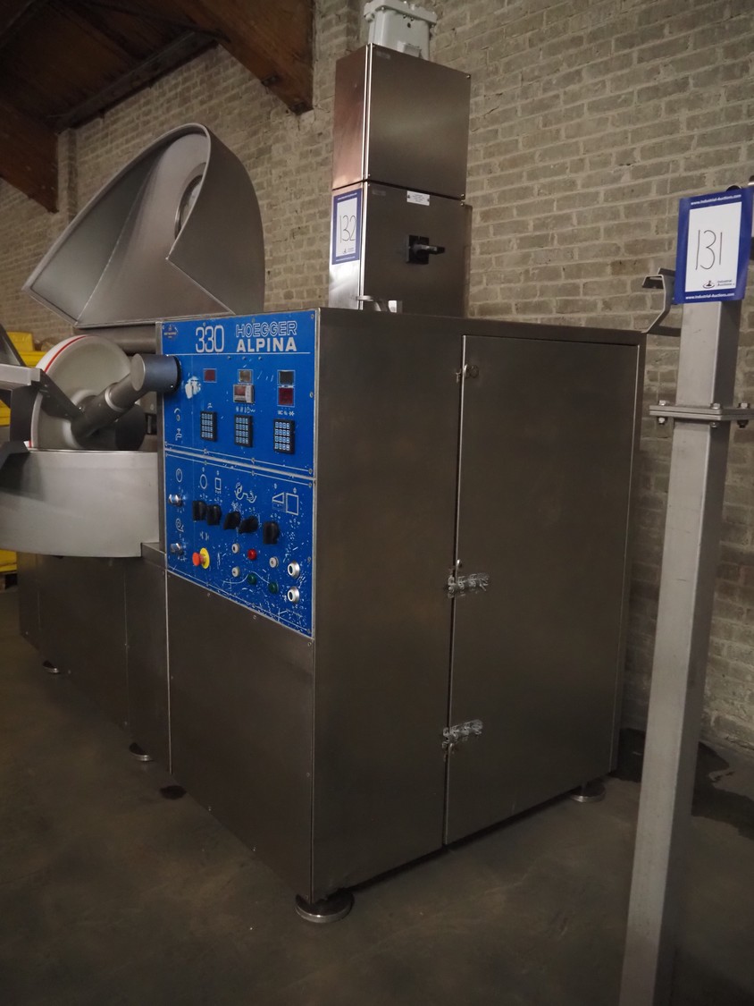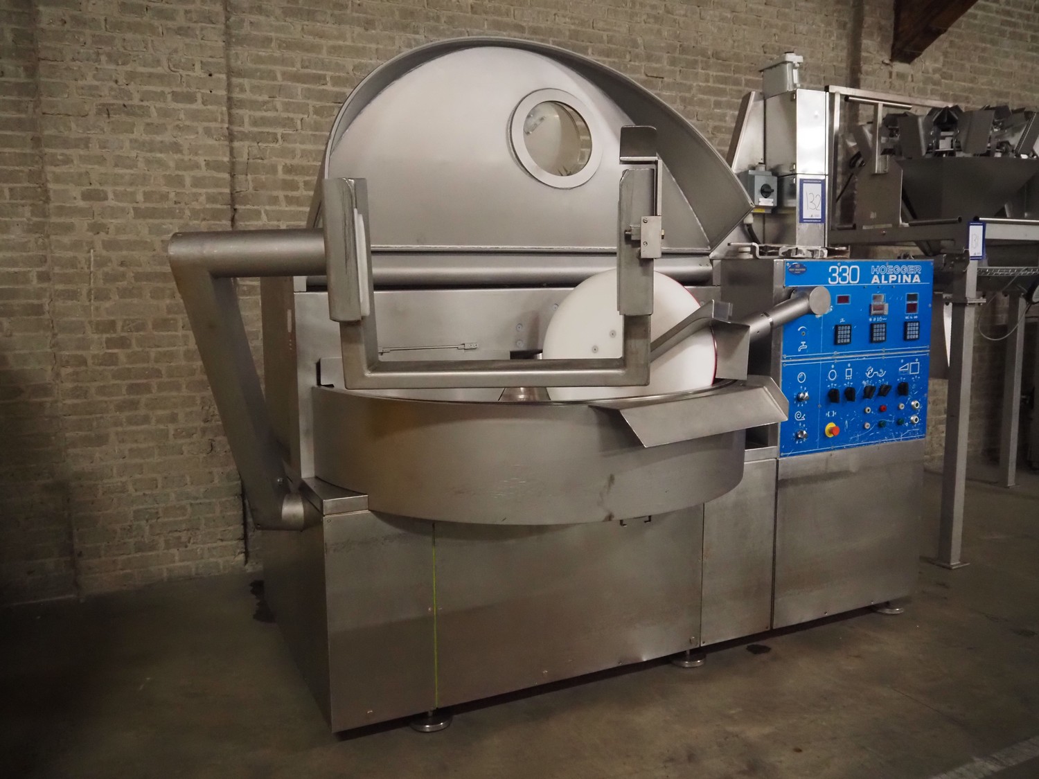 Vacuum cutter Alpina PBV 330-1110 DC Manufacturer Switzerland Year of production Overhauled Technical data overall dimensions 3300x2600x2450 mm; bowl 330 ltr; power supply 400 V, 50 Hz; total power 115 kW / 150 A; knives speeds 550/975/1950/2500/3200/4100 rpm, main motor 103 kW DC; bowl speeds 4/8/12/16 rpm, bowl motor 1,2 kW; mixing speeds 65/130 rpm, hydraulic system 5,5 kW; loader; unloader; vacuum pump Busch 250 m3/h, 5,5 kW; weight 5600 kg.