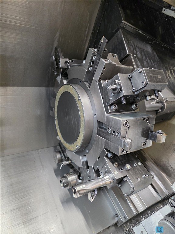 EMAG VTC 250 DUO DDYear of manuf. : 2020 Control : Siemens 840 Dsl Turning diam. : 140 mmTurning length : 700 mm____________Description:In General:Max. workpiece diameter:140 mmChuck diameter:250 mmMax. turning length:700 mmTrack I:Tool carrier I:Tool turret (X/Z)Tool drive:9,600 rpm, 44 NmTool holder:BMTNumber of stations:11 + 1 Part gripperX-axis:310 mmZ-axis:1,115 mmPosition sensors (X/Z):Direct scalesTrack II:Main spindle (OP10):Travelling direct drive spindleSpeed:5,000 rpmPower:33.9 kWTorque:231 NmChuck:Collet chuckClamping cylinder:Hydraulic clamping cylinderSupport control:PneumaticW-axis:772 mmC-axis:0.01°Position sensor (W):Direct scale:Sub-spindle (OP20):Direct drive spindleSpeed:5,000 rpmPower:33.9 kWTorque:231 NmChuck:2+2-jaw power chuckClamping cylinder:Hydraulic clamping cylinderC-axis:0.01°Track III:Tool Carrier II:Tool turret (X/Y/Z)Tool drive:9,600 rpm, 44 N ...