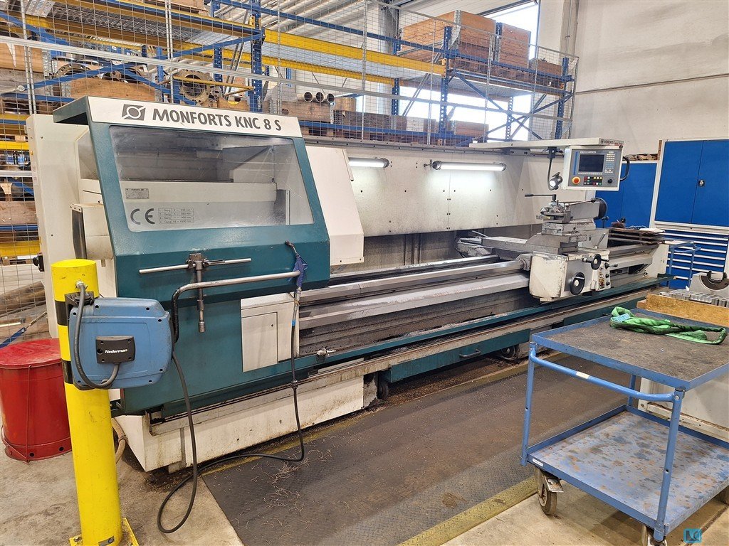 turning diameter:1070 mm turning length:8500 mm total power requirement:62 kW turning diameter over slide rest:800 mm spindle bore:128 mm max. workpiece weight between centers:8000 kg max. workpiece weight:12000 kg bore spindle turning speed range:1,120-01120 U/min tailstock quill diameter:200 mm dimensions of the machine ca.:12 x 2,8 x 2,4 m Machine equiped with Alan Bradley 9 series CNC control - SAUTER 6-postiion revolving head - 360 mm seld centering steady rest - 385 mm rotary work rest (used for gun barrels) - faceplate 800 mm - chip conveyor