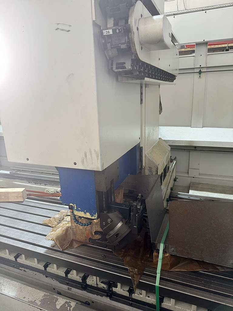 Fanuc 6-assig robotfreescentrum voor aluminium en staal Fanuc R-2000-B/165F CNC: R-30iA CONTROLLER X-beweging van de robot op de rails: 10.500 mm Uitgeschoven robotarmbereik (links en rechts): 3045 mm gt; Maximale werkstuklengte indien het een profiel betreft: 15 meter gt; Maximale werkstukafmetingen zonder uitgeschoven arm: 10.500 x 3045 mm gt; maximale werkstukhoogte: 3500 mm gt; Maximaal gewicht dat aan de robot kan worden bevestigd: 165 kg Gewicht van alleen de robot: 1200 kg Gereedschapswisselaar gemonteerd op rails met 13 gereedschapsposities: - 12 live tools - 1 meetsonde Freeskop: TMA6 17/2 Snelheid: 1 gt; 12.000 tpm ISO 40 - 11 kW Gewicht: 45 kg Technische kenmerken: • Automatische gereedschapswisseling (ATC). • Geïntegreerde thermische beveiligingssensor (motoruitschakeling bij 90 °C). • Pneumatisch gereedschapsklemsysteem (enkelwerkende cilinder met veerretour): – Ci ...