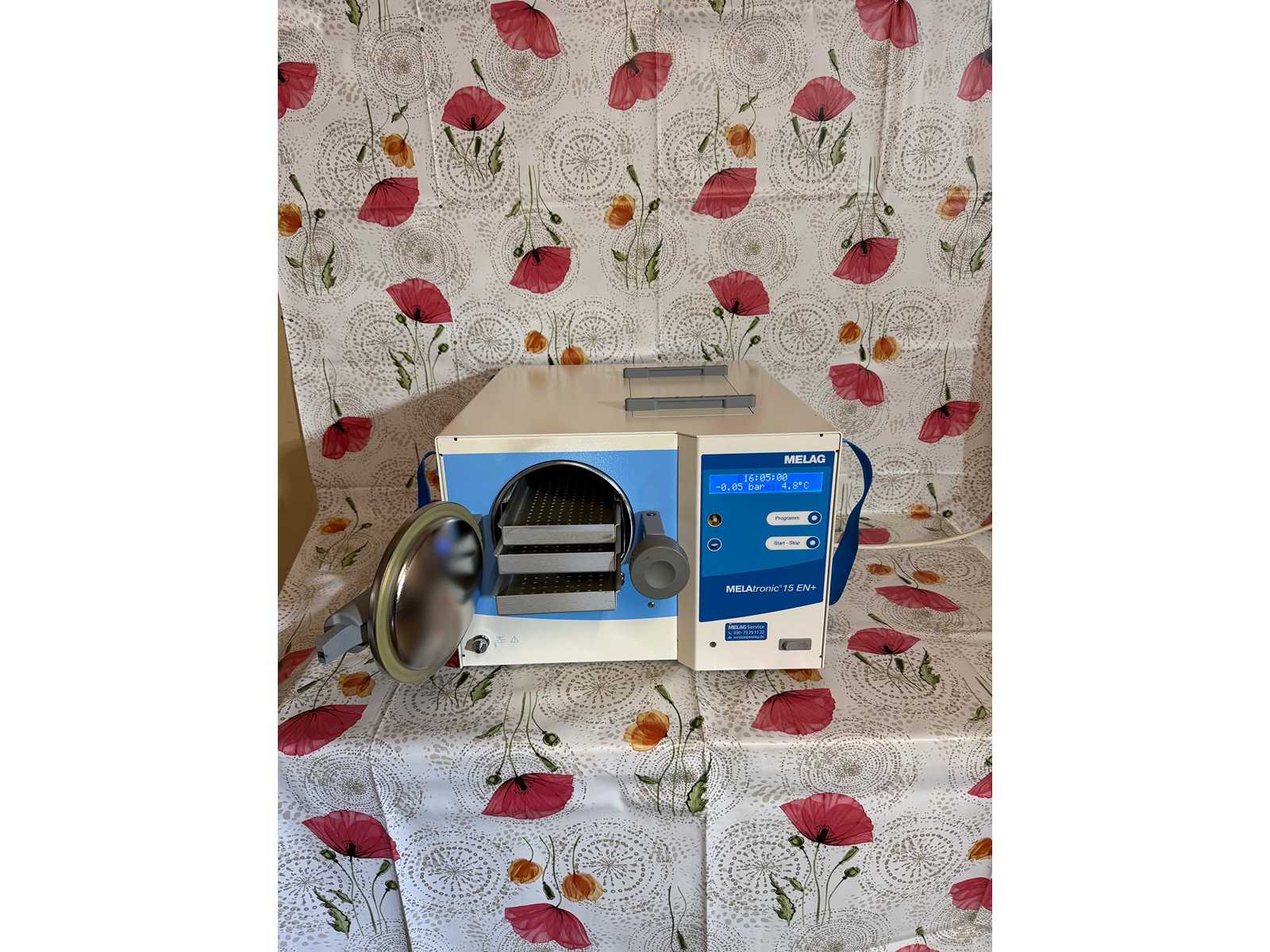 The MELAtronic EN 15+ is a tried-and-tested S-class autoclave that works in accordance with the European standard EN 13060 and is designed for the reliable sterilization of instruments. The control is fully automatic via microprocessor electronics, with an integrated display for easy operation and control. The device offers an active drying function and multiple sterilization programs for different needs. Technical data (approx.): • Sterilization chamber: Ø 15 × 38 cm, volume approx. 7 L. • Maximum load: up to 2 kg of instruments.  • Dimensions: approx. 44 × 33 × 50 cm (W×H×D).  • Power supply: 230 V, 1500 W • Weight: approx. 19 kg.  Unchecked from practice Closure Auction-ID: A7-45427-17