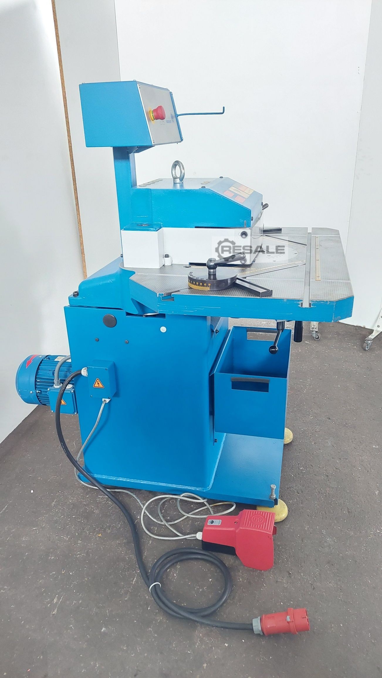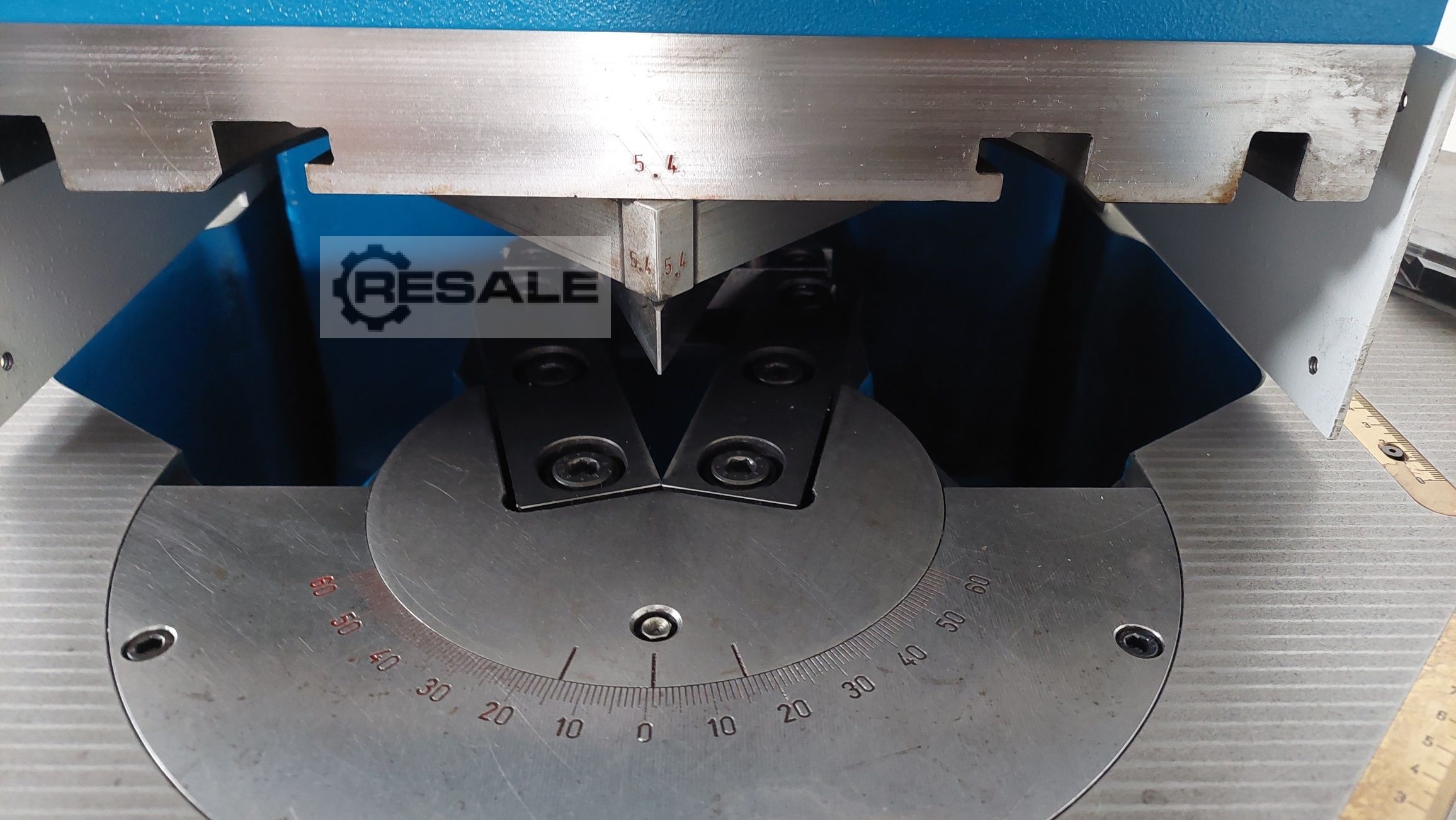 Offer 26125 Technical data: - Cutting length up to 150 mm - Cutting thickness - at 400N/mm² strength 4 mm - at 700N/mm² strength 3 mm - Cutting angle infinitely adjustable 30° - 120 ° - Pneumatic clamping of the cutting angle adjustment - Stroke 22 mm - Stroke rate 60 1/min - Table support surface with T-slots and depth stops - Table height 900 mm - Drive 400 V / 3 kW - E - Footswitch - Space requirement approx. W 1000 x H 1150 x D 1400 mm - Weight approx. 850 kg