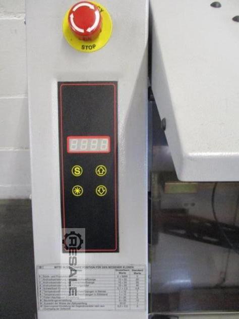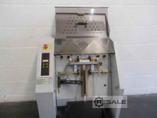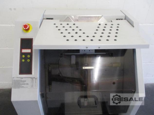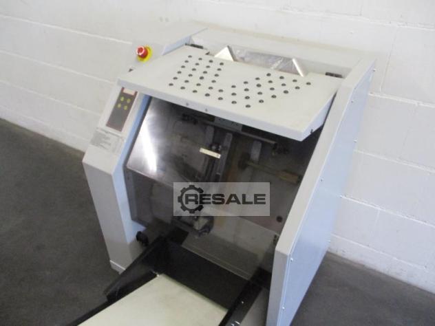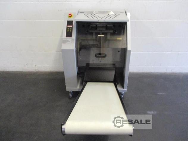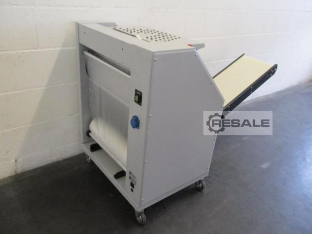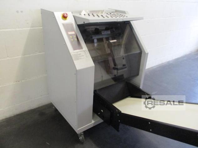 Professional packaging machine from a renowned European manufacturer. Suitable for packaging catalogs, magazines and magazines, for example. The print product is fed to the machine and detected by a sensor. It is then automatically passed through the machine and foiled in the process. The packaged product is transported to working height via a conveyor belt.
