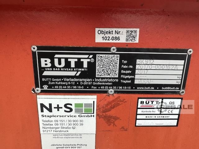 Mobile central axle loading ramp, Bütt, BK912 – used - : Price ex location: 9.950.-€ (net), incl. loading! Manufacturer: Butt Type: BK912 Year of Make: 2017 Payload: 9,000kg Current exam until June 2026 a: Overall length: 11,800 mm Overall width: 2,300 mm Driving width: 1,960 mm Lip width: 2,140 mm Lip length: 400 mm b: 2,500 mm C(min.-max.): 1,100- 1,750 mm hot-dip galvanized safety gratings Side run-over protection Height-adjustable on the drive-over platform Condition: good Available: immediately Location: Nuremberg area