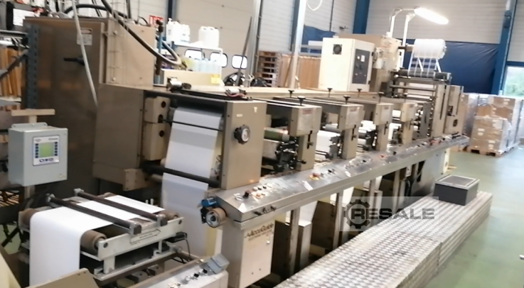 Aquaflex Model LXP 1656 4 colors Print width 420 mm Year 1995 1 single-sided cutting station 3 watermark printing stations 1 UV printing station 1 weeding station 1 hot or cold air cooler Accessories: Cylinder 1 pc 93 1 pc 97 1 pc 101 1 pc 103 1 pc 104 1 pc 105 1 pc 115 1 pc 130 1 pc 135 Length: 7800 mm Width: 3600 mm Height: 2900 mm