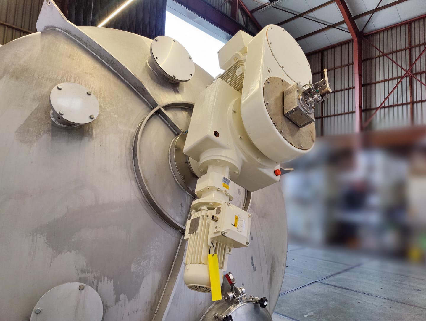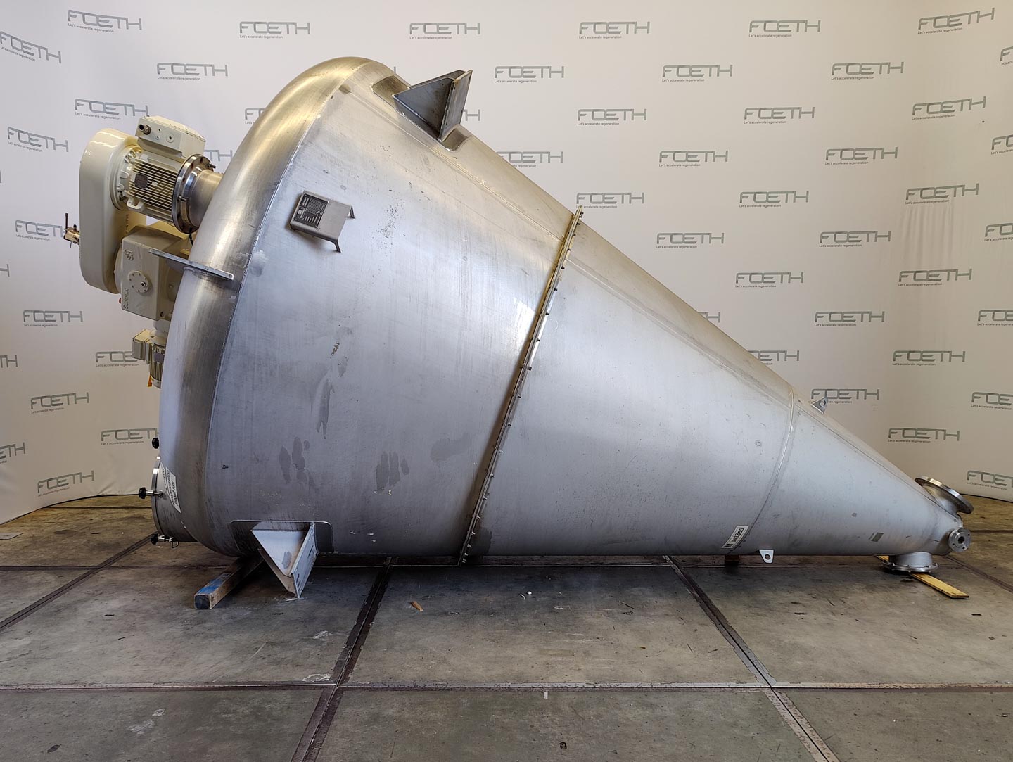 General SKU201P112 MakeBOLZ GmbH No.M 1107 T 4402 Year of construction1988 LocationBarneveld Pressure Working pressure jacket3 Bar Main Features MaterialStainless steel Volume11800 Ltr. Motor15 KW Specified Features - Conical mixer Conical mixercheck Capacity11800 l (gross) Largest cone diameter2900 mm Cone height4900 mm Dished topcheck Manholeø 600mm With stainless steel armcheck Top drivecheck Motorscrew +/- 15 kW (400 V) 65 rpm Motorarm 1,5 kW (400 V) 35 rpm Cantilevered screwcheck With jacket1200 l (20m2) Max. temperature100°C MaterialStainless steel 1.4552 Information Floor space3,2 x 3,2 m Total height6,5 m Weight±7000 kg Extra Specifications- used as a cooler. Conical mixersFeed additivesPaper & otherOther pharmaceuticsCosmeticsOrganicsSugarAnimal feedOther feedConfectionerySolid pharmaceuticsDyes & pigmentsPlastic & rubberMinerals & inorganicPla ...