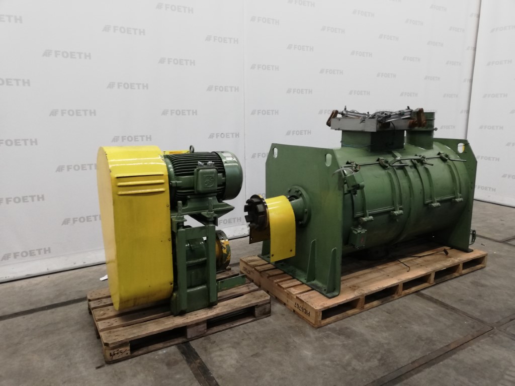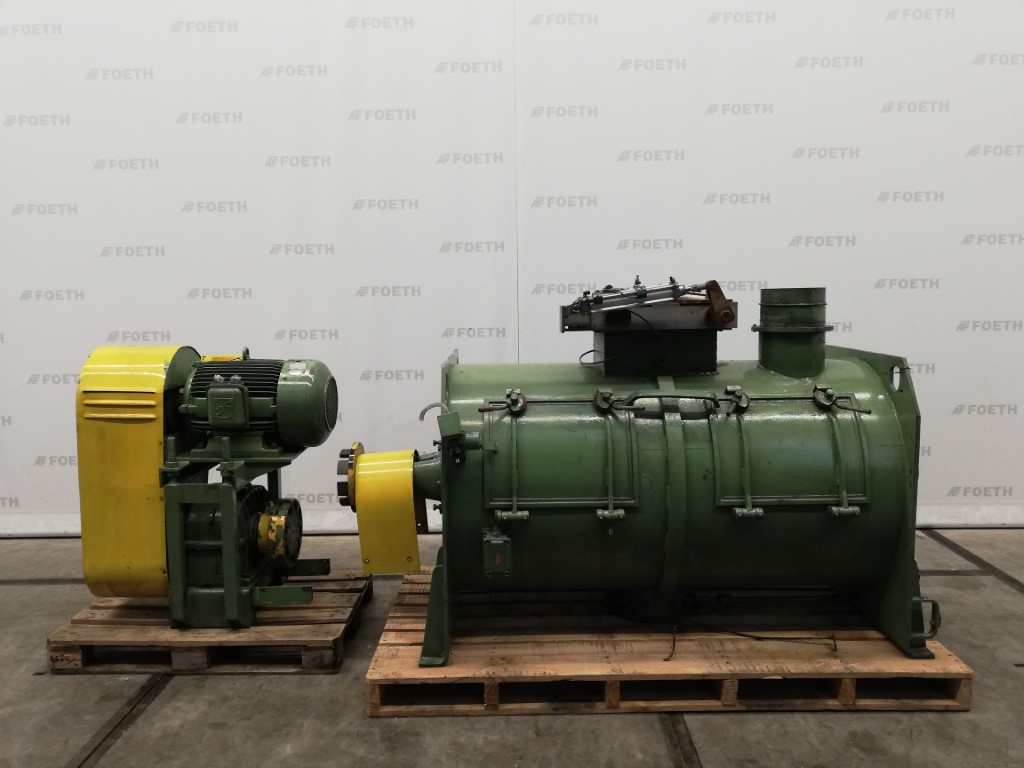 General SKU082Z322 MakeWerner & Pfleiderer, Stuttgart TypeUK-14 X/AU No.154 576 Year of constructionunknown LocationBarneveld Pressure Working pressure6 Bar Main Features MaterialMild steel Volume200 Ltr. Motor17.5 KW Specified Features - Z-blade mixer Jacketcheck Max. temperature220 Degr. C. Screw speed20/40 Rpm Arm speed27/20 Rpm (front/back) Capacity250 Ltr, Useful 200 Ltr Double shaft kneaderMixtruder (1x) Masticator-armscheck Trough sizes740x685mm With covercheck With screw dischargecheck Motor30,0 KW, 380 Volt Motor11,0/17,5 KW, 380 Volt Z-blade mixers MaterialMild steel Information With switchgear(Dim. 80x40x180 CM) Floorspacekneader 2,8x1,4 M Total height1,6 M Weight3200 KG Extra Specifications- Dimensions drive unit 1,4x1,0x1,7 M (LxWxH), weight 2130 KG Technical specs Extra informationtest pressure is achieved at 220 Degr. C.Z-blade mixersDis ...