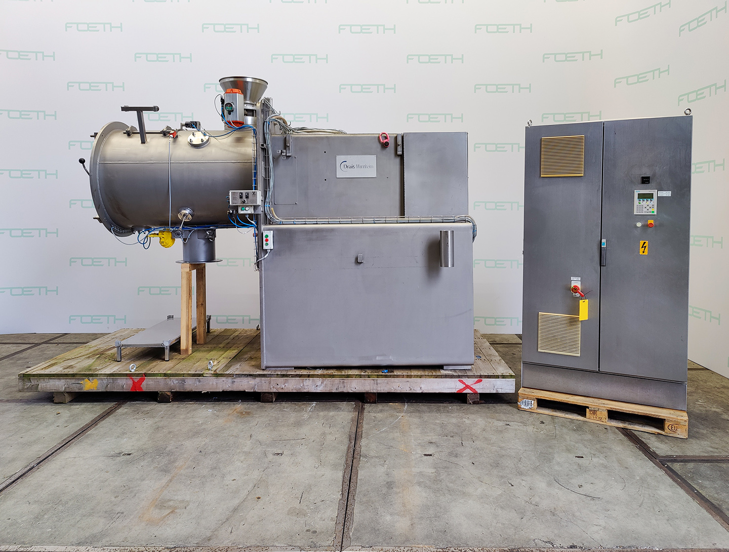General SKU422U1331 MakeDrais Mannheim LocationBarneveld TypeTM 1000 E Main Features MaterialStainless steel Volume1000 Ltr. Motor30 KW Specified Features - Powder turbo mixer MaterialStainless steel 1.4571 (316Ti) Powder turbo mixercheck Capacity1000 Ltr. Trough sizesDia. 940x1500 mm InletDia. 250 mm Inspection hatch450x450 mm OutletDia. 300 mm Max. temperature50°C With adjustable packing glandscheck Motor30kW, 400/690Volt, 1480rpm. With frequency controllercheck Speed mixing shaft20-120 rpm. Information No.56216 Year of construction2001 With switchgearcheck (as is) Sizes switchgear1,2x0,5x2,3 m Floorspace4,3x1,85 m Total height2,7m Weight6100 kgPowder turbo mixersCatalysts & fillersFeed additivesOther pharmaceuticsCosmeticsFood additivesSugarAnimal feedOther feedConfectionerySolid pharmaceuticsDyes & pigmentsMinerals & inorganicSpicesOther chemicalStarchT ...