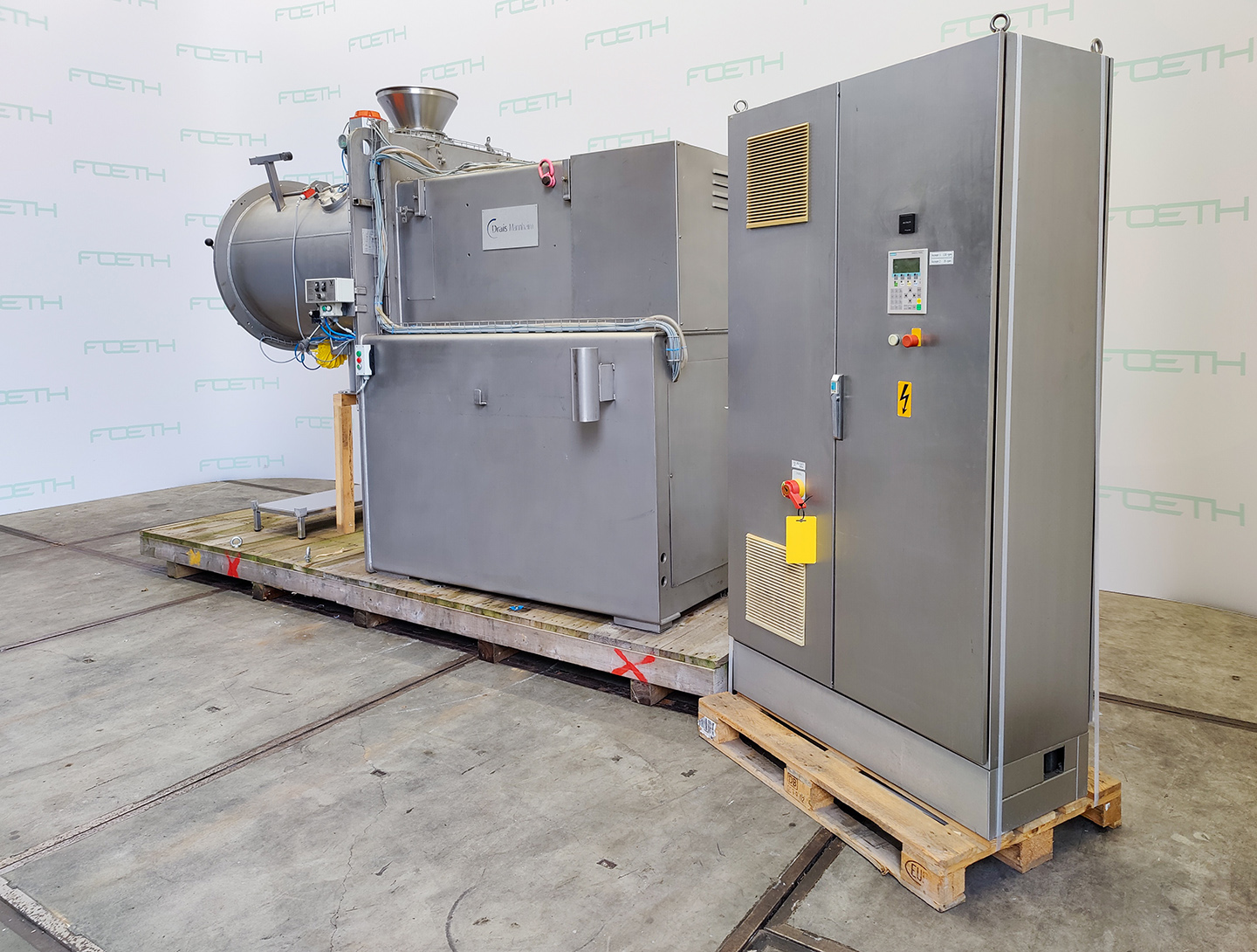 General SKU026W131 MakeDrais TypeKT-400 Year of construction1991 Mounted on framecheck Main Features MaterialStainless steel Volume400 Ltr. Motor18.5 KW Specified Features - Powder turbo mixer Powder turbo mixercheck Continuous mixercheck Capacity400 l. Trough sizesø 600 x 1450 mm Inlet250 x 300 mm Top connectionscheck 4x Inspection hatch400 x 370 mm Outlet290 x 250 mm With adjustable packing glandscheck Motor11,0 kW (380 V, 1450 rpm) Speed mixing shaft100 rpm With lump breakercheck Motor7,5 kW (380 V, 2780 rpm) Speed lumpbreaker2870 rpm MaterialStainless steel Information LocationBarneveld Floorspace2,8 x 1,5 m Total height1,7 m Weight1640 kgPowder turbo mixersCatalysts & fillersFeed additivesDiscountOther pharmaceuticsCosmeticsFood additivesSugarAnimal feedOther feedConfectionerySolid pharmaceuticsDyes & pigmentsMinerals & inorganicSpicesOther chemicalSt ...