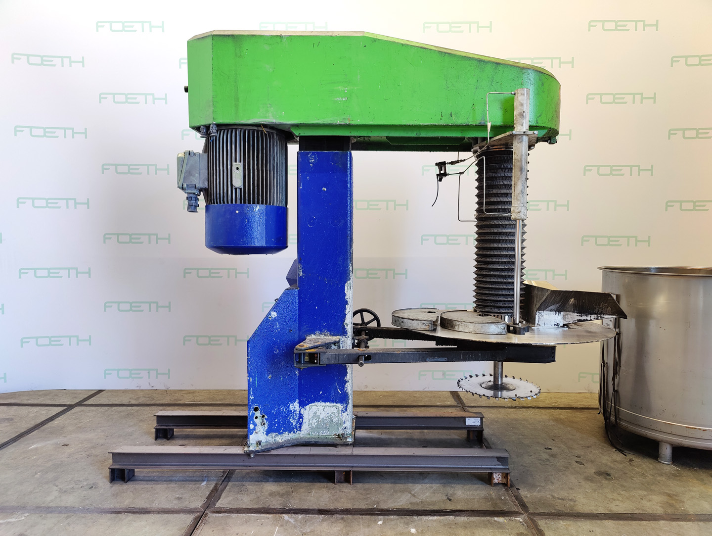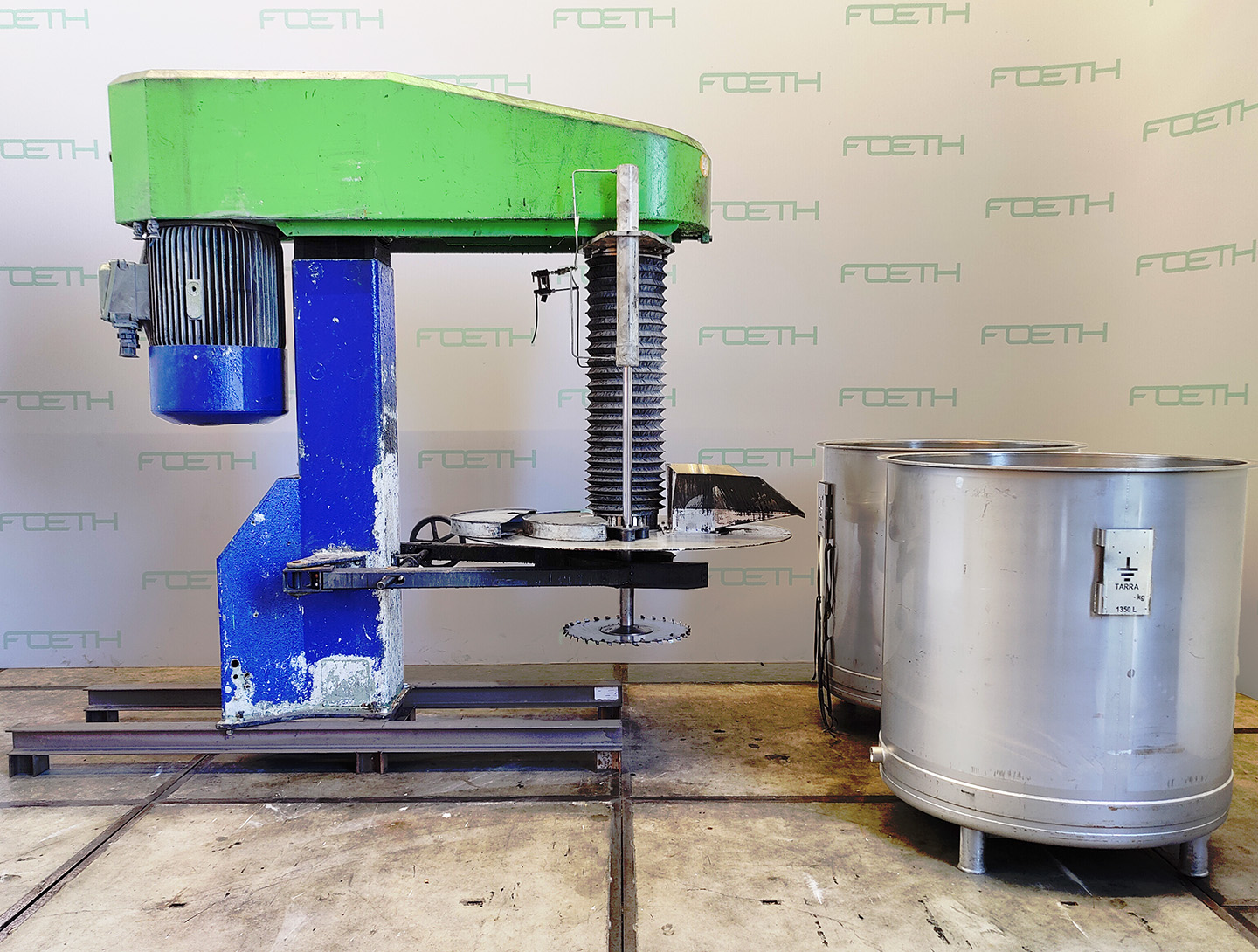 General SKU288S377 MakeNetzsch TypeNMD 668.62 No.2100310 Year of construction2006 LocationBarneveld Main Features MaterialStainless steel Volume1250 Ltr. Motor45 KW Specified Features - Dissolver Dissolvercheck Shaft length1200 mm Disc diameter450 mm Motor45 kW 380-420/660 -725 Volt With pans(1x) Capacity1250 ltr Pan sizesdia. 1150x1300mm Outletdia. 45mm With hydraulic liftingcheck Motor2,2 kW 400 volt (Ex) MaterialStainless steel Information Floorspace2,3x1,6 M Total height2,4 M Weight1700 Kg CEcheckDissolversCatalysts & fillersSolventsDetergent & surf.Other pharmaceuticsLubricants & oleoOther feedDyes & pigmentsMinerals & inorganicOther chemicalFine chemicalsOintmentsPaints & coatingsOils & fatNetzschMixers > DissolversIndustries > Chemical > Catalysts & fillersIndustries > Chemical > SolventsIndustries > Chemical > Detergent & surf.Industries > Pharmaceutic ...