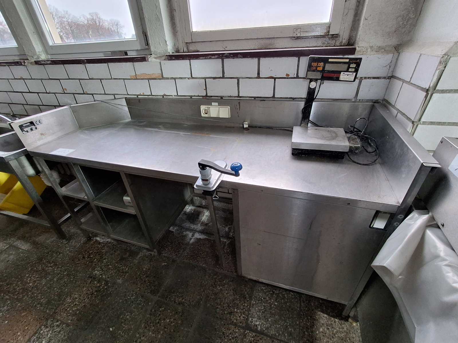 Stainless steel work table KRONEN with backsplash + can opener + scale, scale type Sartorius Auction-ID: A7-45677-10