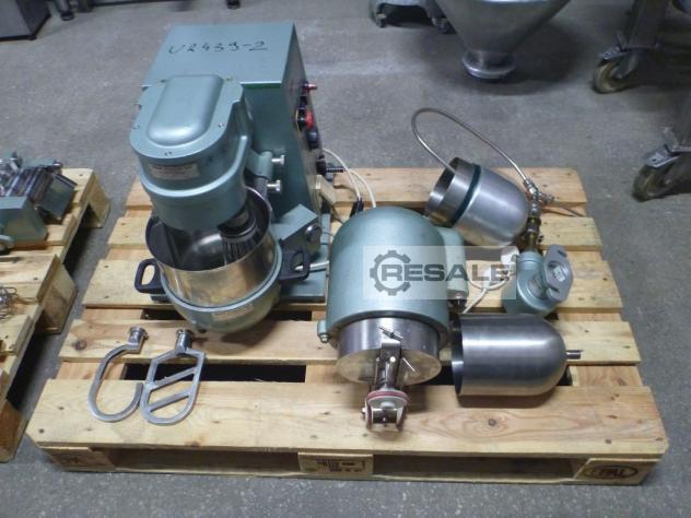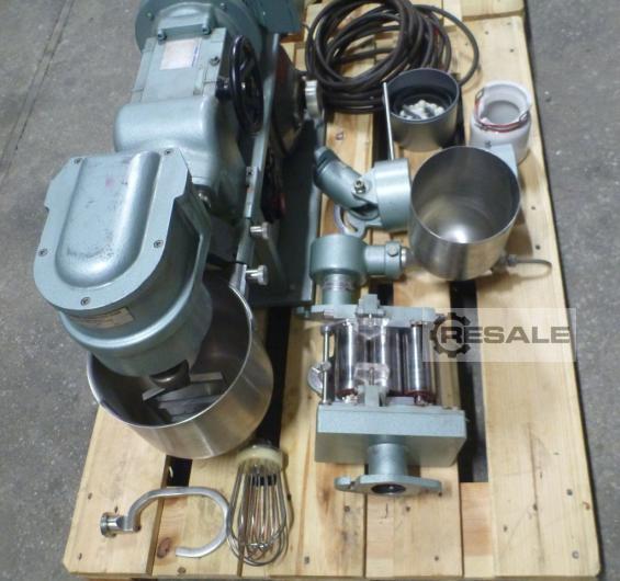 Stock # U2439-2 Used Erweka (DE) multi-task lab size set with drive AR400. Unit is driven by el motor 0.5 kW, 3000 rpm, 220 V, 50 Hz. Output rotation adjustable in range from 0-400 rpm. As a set there are included: - planetary mixer type PRS with agitators - frame, wall scrapper, hack type, whisk type. Including electrically heated mixing pan type DER. El heater power 500 W. Total volume of mixing pan about 6,5 l. - single piston homogeniser type HO with stainless steel electrically heated product hopper with volume about 2.8 l. Additional stainless steel hopper with volume about 3 l, and bypass stainless steel pipe. Output up to 30 kg/h. - Stainless steel vertical jacketed mixing tank type SG3W with belt driven 3 level paddle agitator. Bottom discharge. Total volume about 5 l. All devices last time had been working in cosmetic industry.