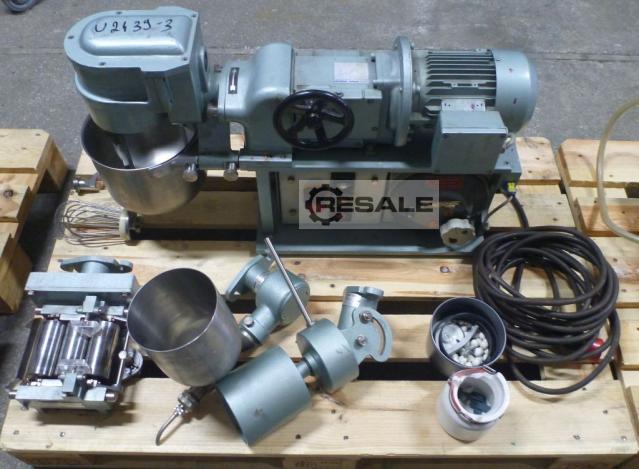 Stock# U2439-3 Used Erweka (DE) multi task lab size set with drive AMD/EX. Unit is driven by el motor 0.37 kW, 920 rpm, 380 V, 50 hz. Ex design and is equipped with vari speed gearbox. Output rotation adjustable in range from 46-410 rpm. As a set there are included: - stainless steel three roll mill type SMS - rolls with width 107 mm x diameter 50 mm. Output in range 2-20 kg/h. - planetary mixer type PRS with agitators - frame, wall scrapper, hack type, whisk type. Total volume of mixing pan about 6l. - single piston homogeniser type HO with stainless steel product hopper with volume about 3 l. Output up to 30 kg/h. - universal drive arm type UG with device for mounting ceramic ball mill type KM 0, mill volume 0.5 l, includes ceramic milling balls. All devices last time had been working in cosmetic industry.