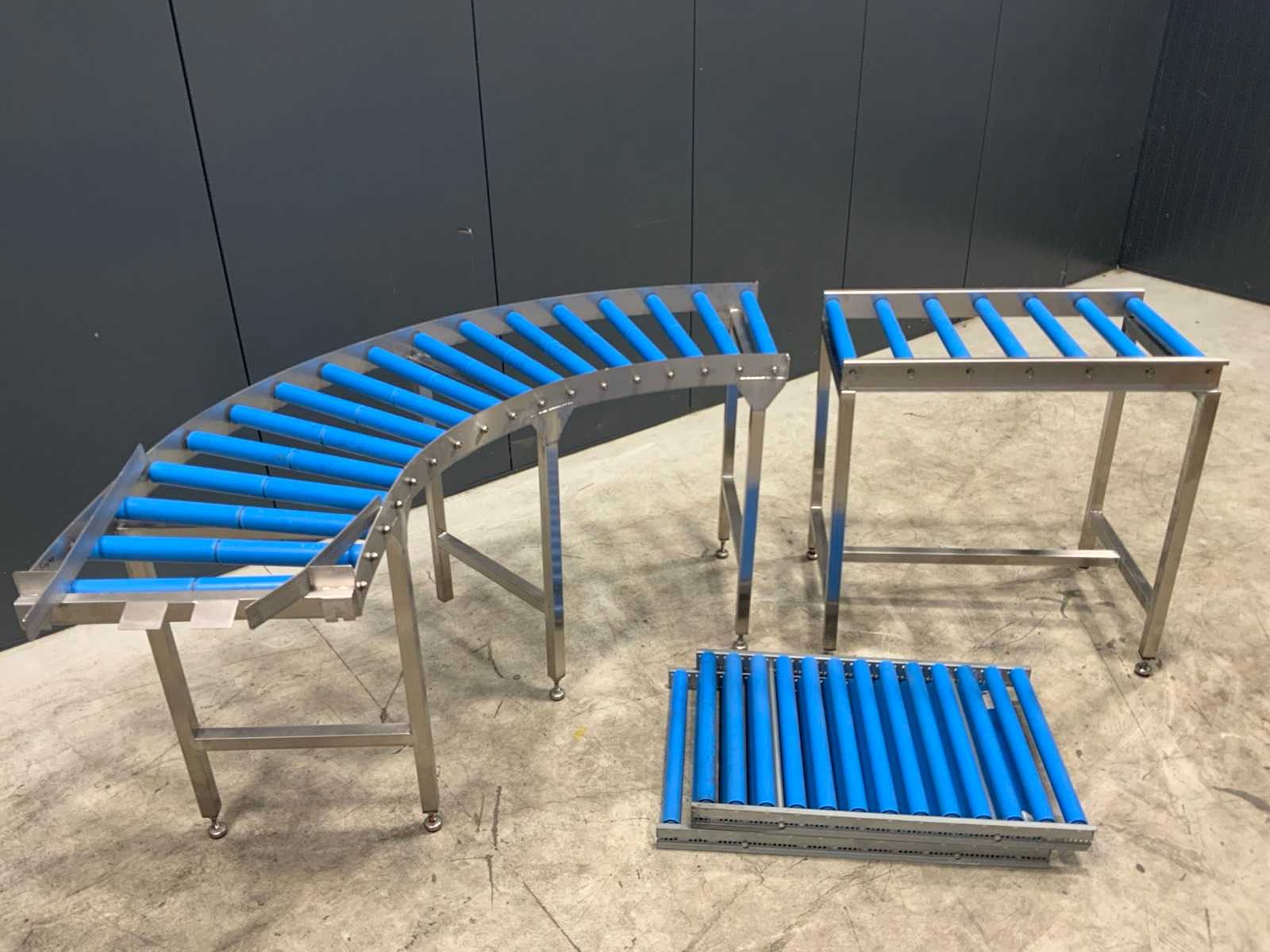 Consisting of: 1x Roller conveyor 90 degree bend 150 x 150cm, height 105cm. 1x Roller conveyor straight 100cm, height 105cm. 2x Roller conveyor piece 100cm. Auction-ID: A1-43790-32