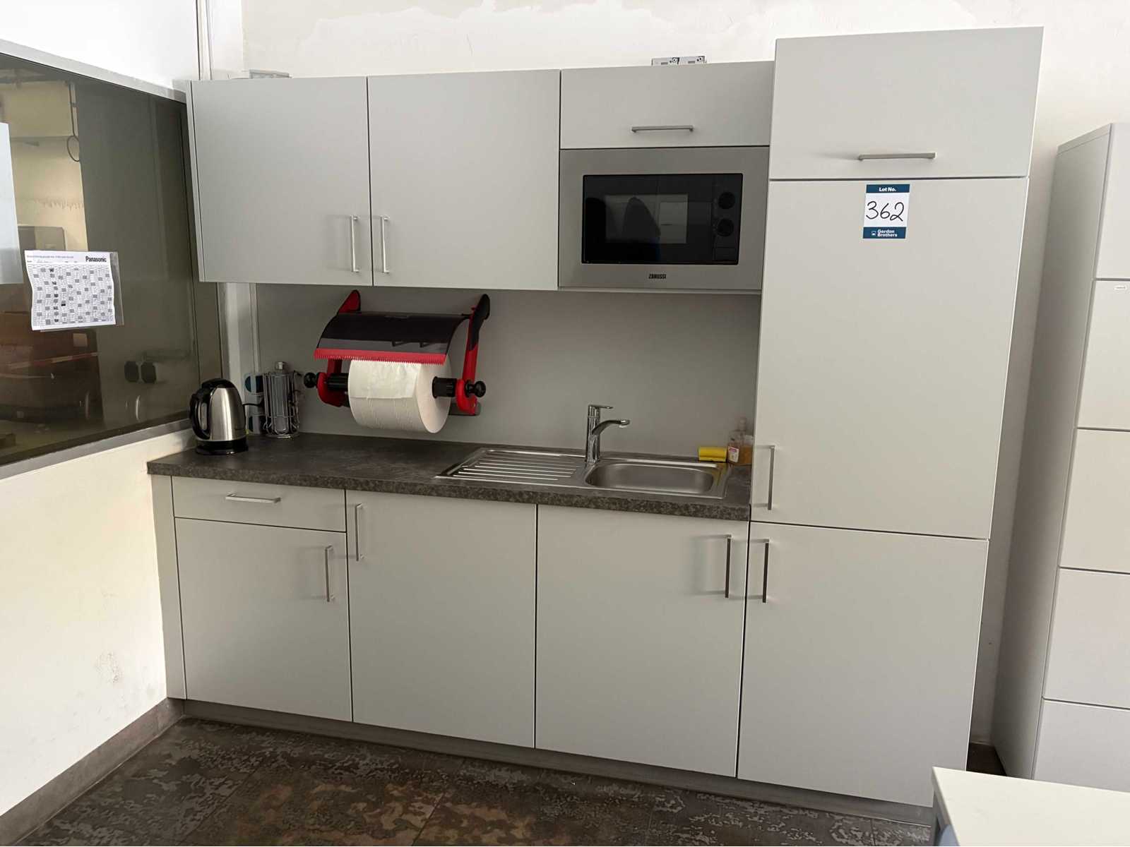 Contents of kitchen including fitted unit with Stainless steel sink, Zanussi microwave and fridge freezer, pigeonhole lockers, sliding-door storage units, table and chairs Auction-ID: A1-45187-362