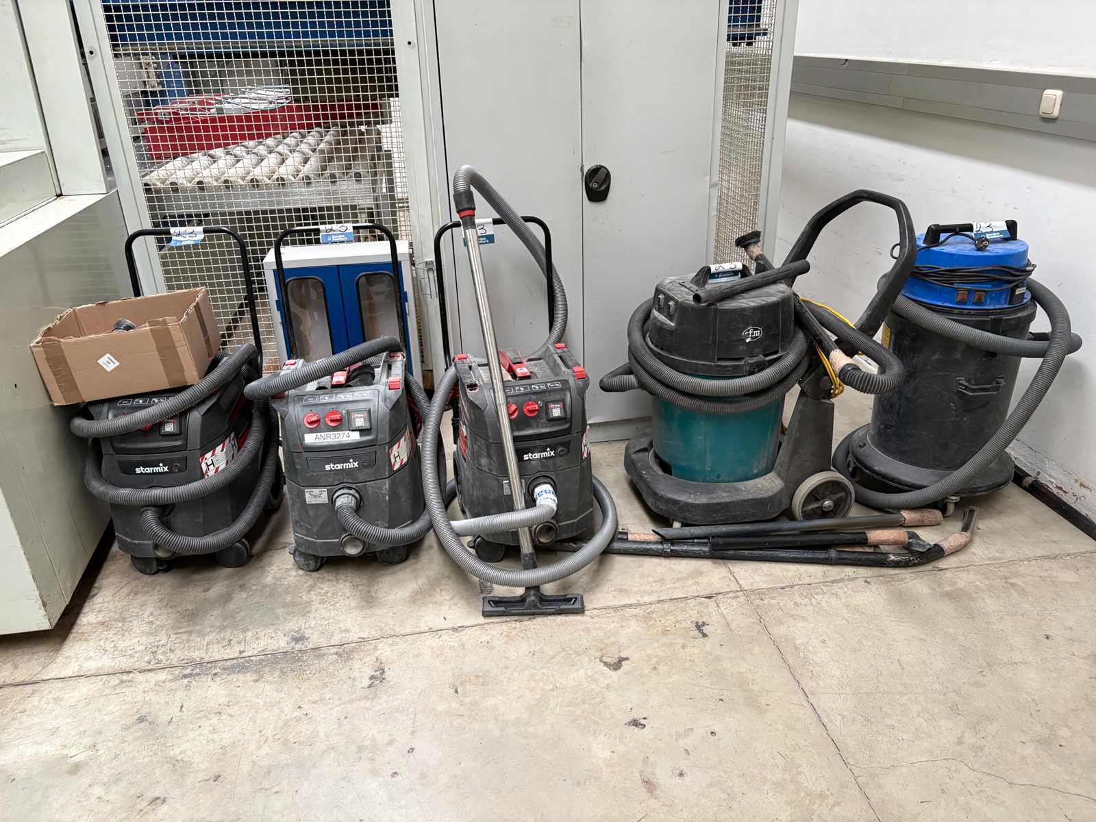 Five workshop vacuum cleaners as listed, 3 x Electostar ISP 220/240 volt 1400 watt, 1 x Eurokraft 230 volt 1300 watts, 1 x CFM GWD 350-2 220/240 volt 3000 Watt all with vacuum hoses. Auction-ID: A1-45187-23
