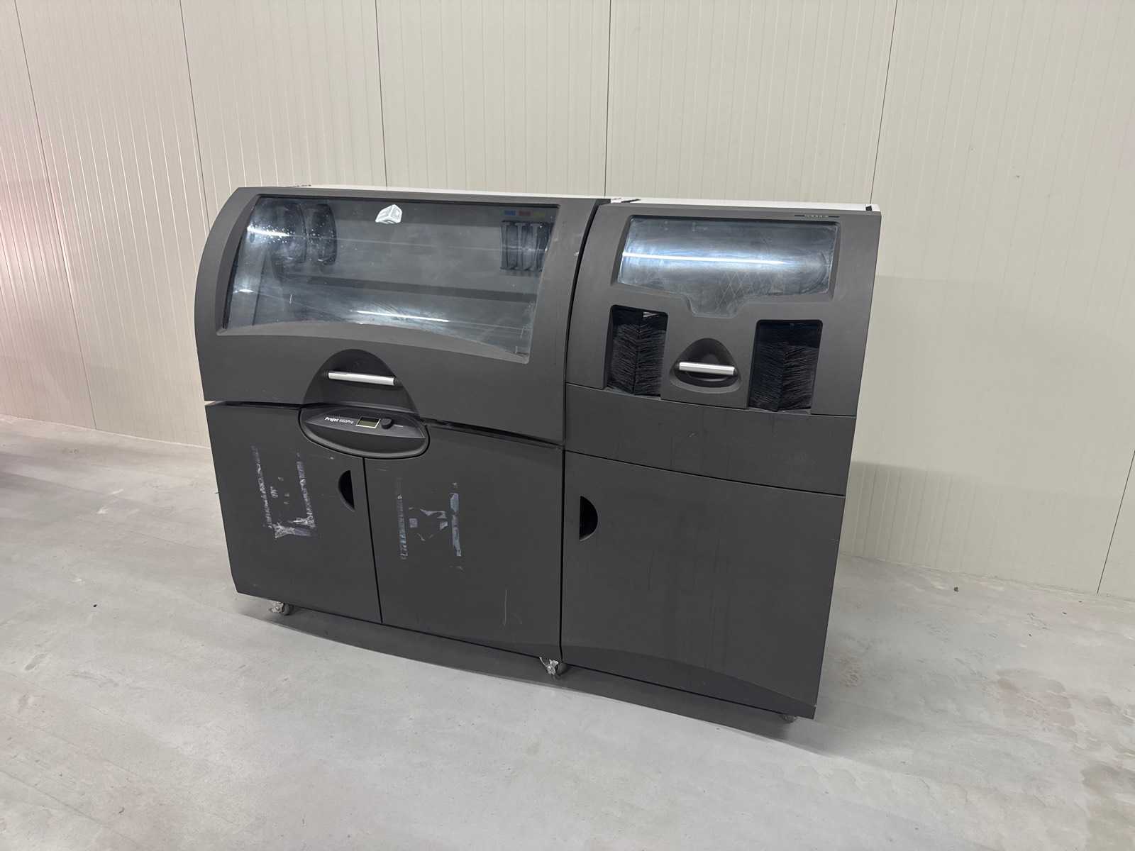 Print Speed and Resolution Resolution: 600 x 540 dpi. Color capacity: More than 6 million colors (full 4-channel CMYK). Vertical construction speed: Maximum 28 mm per hour. Minimum detail size: 0.1 mm. Layer thickness: 0.089 to 0.102 mm. Build volume and physical properties Maximum build volume (X x Y x Z): 254 x 381 x 203 mm. Weight: 340 kg. Number of print heads: 5 (for CMYK and binder) with a total of 1520 nozzles. Materials and Usage Base material: VisiJet PXL (a high-performance composite powder). Automation: Features a fully automated system for loading, recycling, and removing powder. File formats: Supports STL, VRML, PLY, 3DS, FBX, and ZPR. Applications: Commonly used for architectural models, medical visualizations, consumer product prototypes, and art. Auction-ID: A1-44905-161