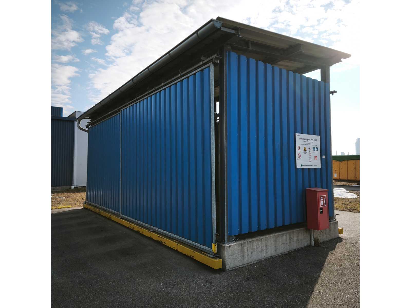 Material / storage container with side roll-up doors on both sides, galvanized steel substructure clad with blue trapezoidal panels, mounted on a concrete base. Dimensions LxWxH in cm 800x345x350 Auction-ID: A1-45187-400