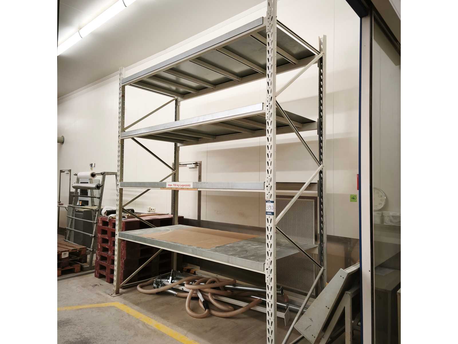 1x Heavy-duty shelving with steel sheet shelves, load capacity per bay 700kg, dimensions LxWxH in cm 285x117x310, 2x uprights / 8x crossbeams / each level with detachable intermediate crossbeams, 4x steel sheet shelves Auction-ID: A1-45187-390