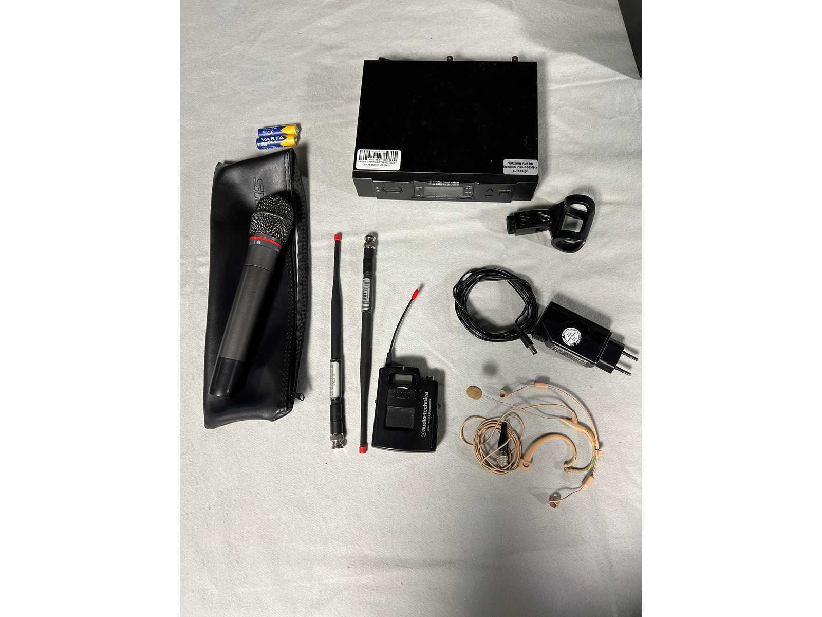 Sale with the following accessories: 1x ATW-R3100b - single station (G-band), 721.500 – 746.375 MHz 1x ATW-T341b handheld transmitter (dynamic, cardioid, G-band) 1x Microphone Clamp 2x Audio Technica Stub Antenna BNC (G-Band - red) 1x Power Supply Auction-ID: A7-45172-55