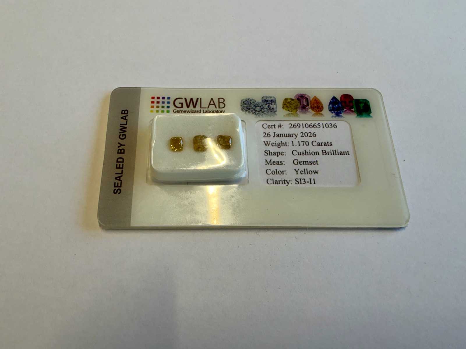 3 natural Fancy Yellow diamonds in cushion brilliant cut with a total weight of 1.17 ct. Different shades of yellow with characteristic colour intensity. Supplied in sealed GWLAB packaging including certificate. Suitable for jewellery production or further processing in commercial trade. Item number: 269106651036 Auction-ID: 04F-RBA-1
