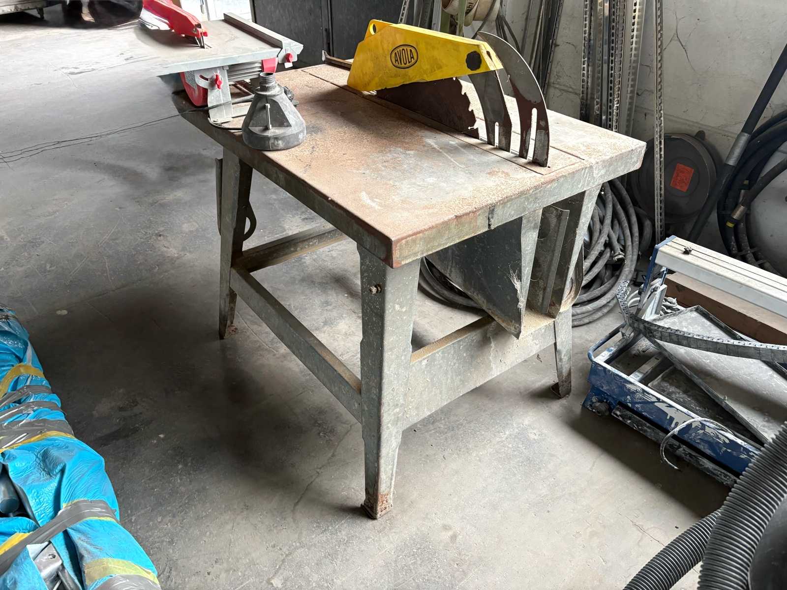 • Stationary masonry / cut-off saw with large diamond cutting blade • Robust industrial design on a stable steel frame • Suitable for cutting concrete, natural stone, paving stones or similar materials • Side-mounted belt-driven electric motor • Swivelling saw arm with protective cover • Connection for dust extraction available • Integrated emergency stop switch on the frame • Shelf below the work surface Technical data (nameplate not visible, information estimated): • Mains connection: 400 V high-voltage current • Saw blade diameter: approx. 400–500 mm • Cutting depth: approx. 120–150 mm Dimensions: • Length: approx. 1,200 mm • Width: approx. 700 mm • Height: approx. 900 mm Weight: • Total weight: approx. 200 kg Condition: • Significant signs of wear • Rust on the frame and protective cover • Contamination due to construction site use • Func ...
