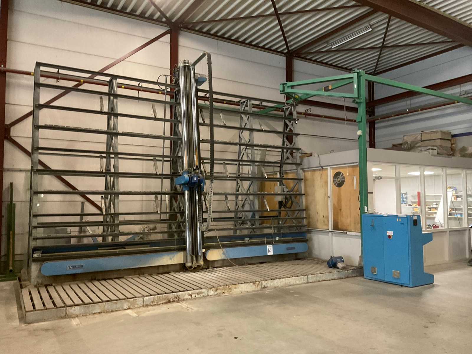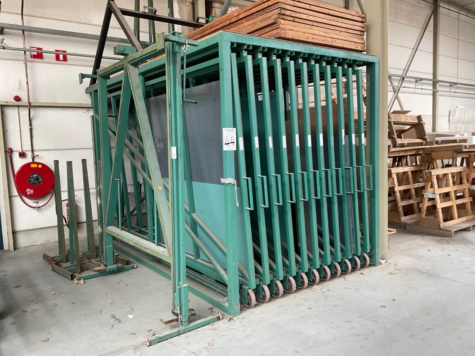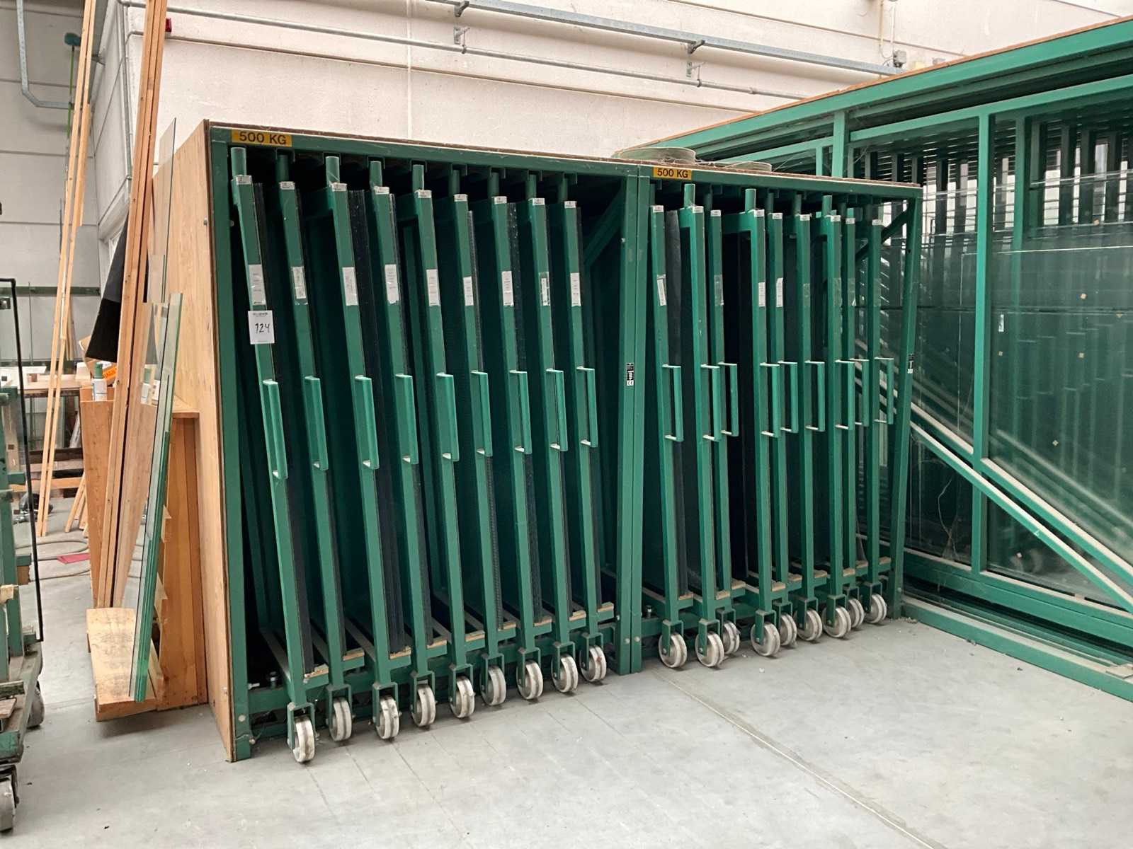 Equipped with: (18x) glass slide, Capacity per slide: 500kg, Maximum height: 1700 mm, Maximum length 3000 mm, with glass stock content Auction-ID: A1-44279-124