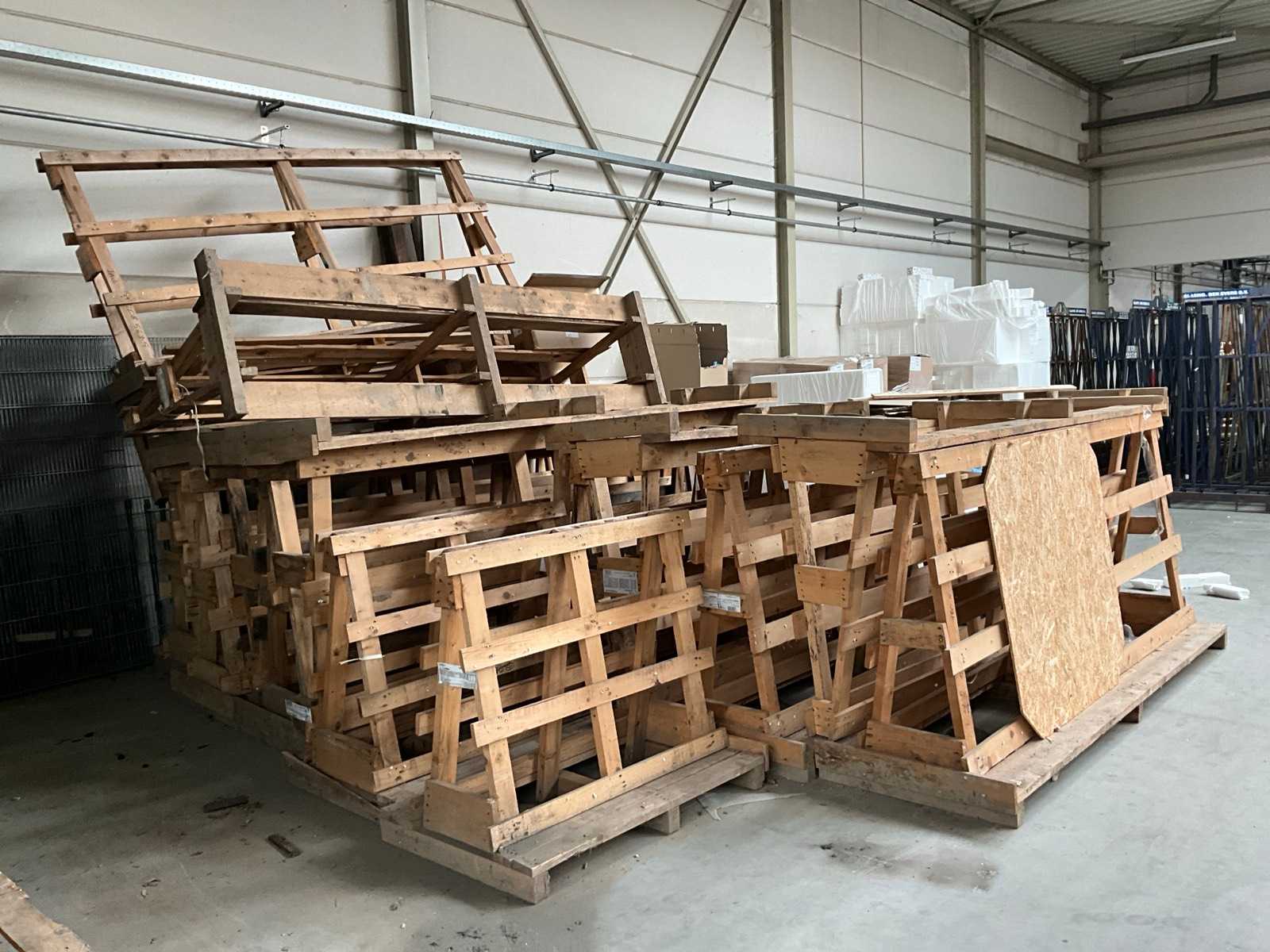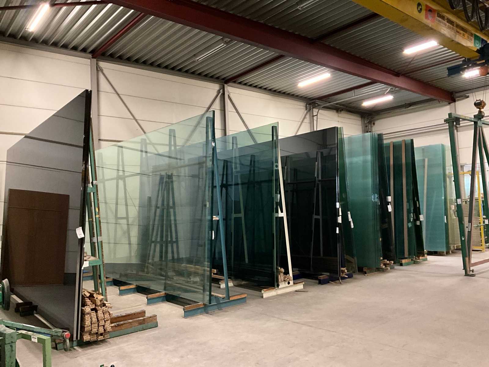 Batch of various types of glass plates in 15 trestles, various thicknesses 4, 6 and 8 mm, steel trestles are included Auction-ID: A1-44279-100