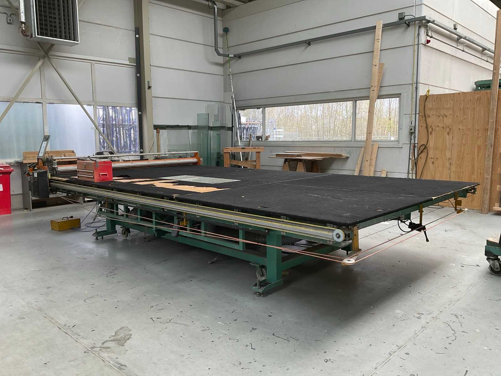 suitable for automatic cutting, decoating (Low-E) and breaking of float glass up to jumbo size (approx. 6100 x 3210 mm). The installation is made up of, among other things: (1x) Hegla tilt table (infeed), mobile (1x) Hegla air cushion supply table with 4 conveyor belts and directional blocks. (1x) Hegla transport table, Type: TWK 7033 7000 x 3700mm, working height: 860mm, 7 conveyor belts Year of manufacture: 2007, serial number: 35320. (1x) Hegla cutting bridge, Type: Optimax 6133 Plus Maximum glass size: 6100 x 3210mm Glass thickness: 3 – 12mm Cutting speed: 160 m/min Accuracy: 0.2mm Equipped with Low-E decoating Year of manufacture: 2007, serial number: 6397. (1x) Hegla crushing station (X-direction), Type: STB II 33-12 Working height: 860mm, glass thickness: 3 – 12mm Year of construction: 2007. (1x) Hegla angle transfer, Type: E 3333 3300 x 3300 mm, Working height: 860 mm Ye ...