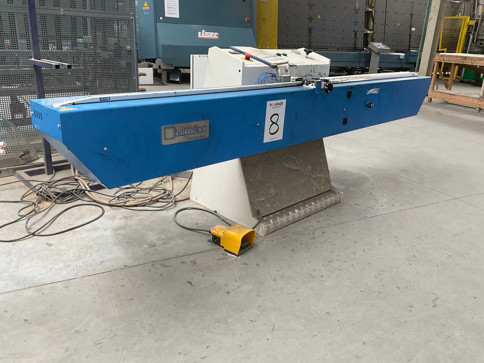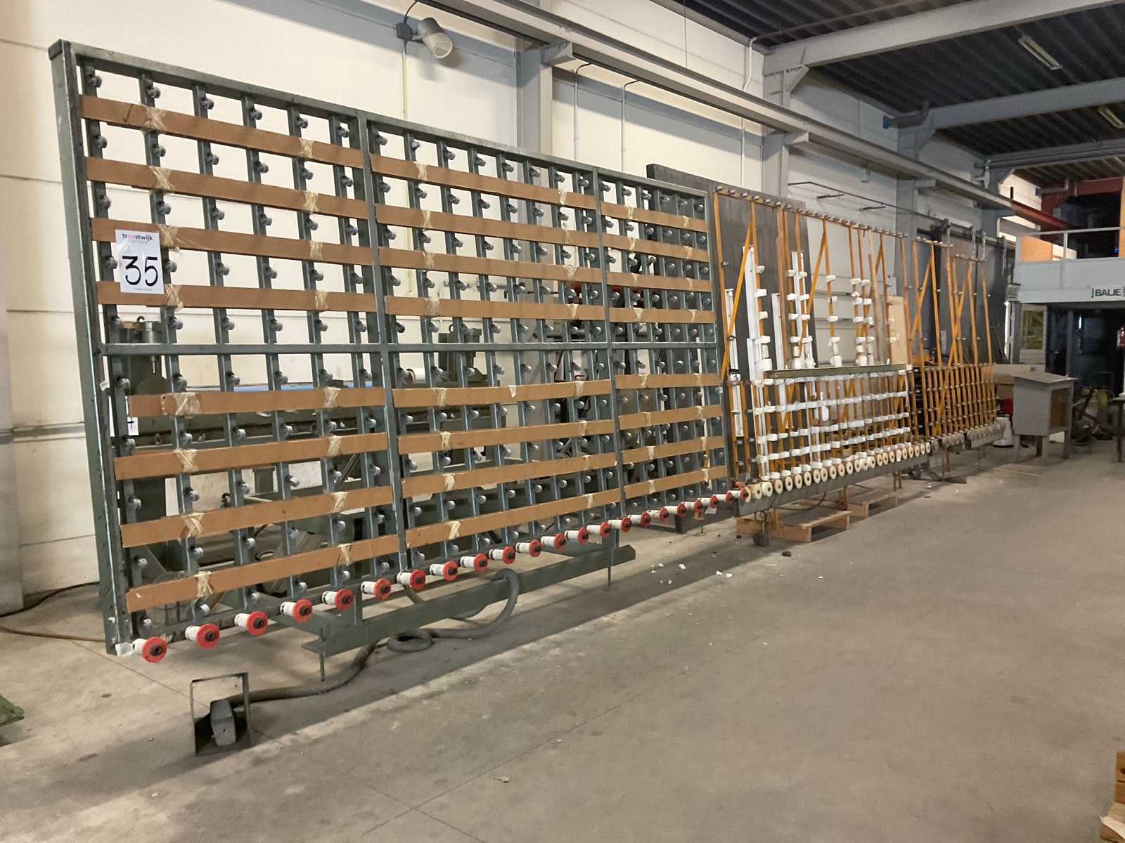 Tiltable cutting table with roller conveyor. Equipped with: foot control. Includes: (2x) vertical glass buffer rack Size: 3700x800x2500mm and 2350x700x2500mm, (1x) illuminated back panel 2700x1600x2850mm. Auction-ID: A1-44279-35