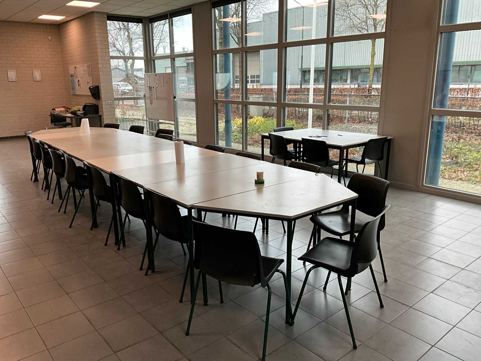 Canteen set consisting of: (9x) straight tables, (2x) trapezoidal tables, (24x) stackable canteen chairs. Auction-ID: A1-44279-155