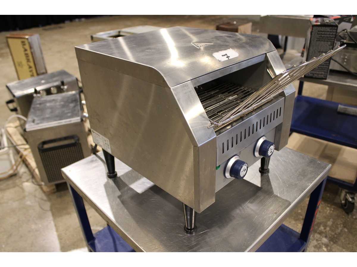 Two slices of bread fit side by side on the conveyor belt. Two separate heating elements. Suitable for continuous toasting of sliced bread. Equipped with a front and back tray. The transit time can be set to 3 minutes. Auction-ID: A7-44746-13