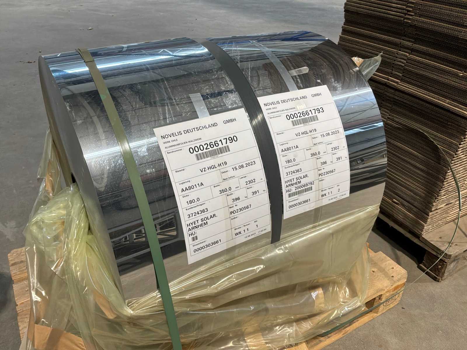 Aluminium foil strip, foil thickness 0.18 millimetres, strip width 800 millimetres, length 2502 metres, approximately 970 kilograms per roll