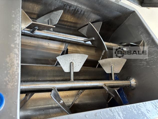 The Velati M 2000 twin shaft paddle mixer is a robust and reliable industrial device, specially designed for food processing in commercial kitchens or production facilities. This type of used mixer is characterized by its high capacity and efficiency in mixing a wide variety of ingredients. Thanks to the twin shaft technology, the M 2000 ensures even mixing of the materials while minimizing mixing time. The paddles are designed to ensure optimal mixing without excessive friction, which maintains product quality. The stable construction of the device offers long-lasting performance and lower maintenance requirements. Ideal for use in food processing, this mixer is a valuable addition to any company that requires high-quality and consistent mixes., power: approx.: 1,600 kg mixing volume, Dimensions / weight: Mixer: L x W x H: 4,650 x 1,500 x 1,950 mm, auger: L x W: approx. 5,100 x 2,000 mm ...