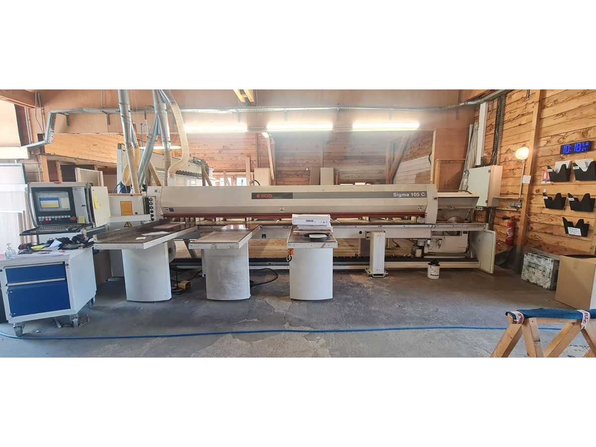 Machine: SCM SIGMA IMPACT 105 C Flat Saw Year: 2003 Useful cutting length: 4500 mm Useful cutting depth: 4500 mm Blade overhang: 105 mm Press: grooved Trolley speed: 30 m/min Pusher: 9 pneumatic clamps Tables: 3x 1500x600 mm in bakelite Ø main plank: 380 mm Main blade motor: 10 hp Ø scoring blade: 160 mm Incisor motor: 2 hp Weight: 4400 kg Consumption: 55 A Suction: 2x Ø120 mm + 1x Ø150 mm Power supply: CE, 380 V Auction-ID: A1-45443-9