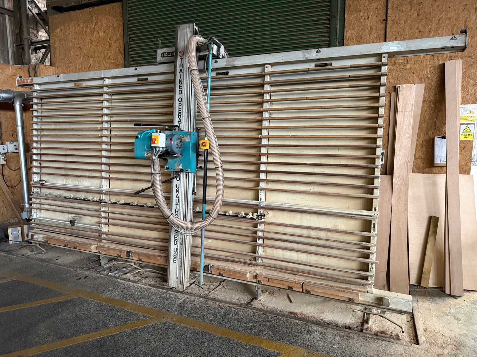 HARWI 1850 Giraffe Vertical Panel Saw Brand: Harwi Type: 1850 Giraffe M-No.: 5008KM Year of Make: 2003 Max. cutting width: 1,850 mm Max. cutting length: 4,300 mm Max. cutting depth: 55 mm Saw blade diameter: 250 mm Saw blade bore: 30 mm Motor power: 3.0 kW, 400 V, 4.3 Amp Saw blade speed: 2,800 rpm Bottom support: Yes Material support: Closed back panel Small parts edition: Yes Measuring system: vertical and horizontal analogue Swivel saw head : manual Saw feed : manual Mounting : Freestanding stand Suction : Suction supports on the saw Locking saw bar : manual Suction diameter : 80 mm with built-in compressor on the saw carriage Dimensions : 5,200 x 1,300 x 2,700 mm Weight: 570 KG