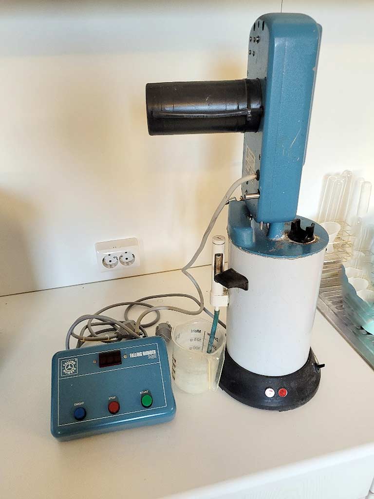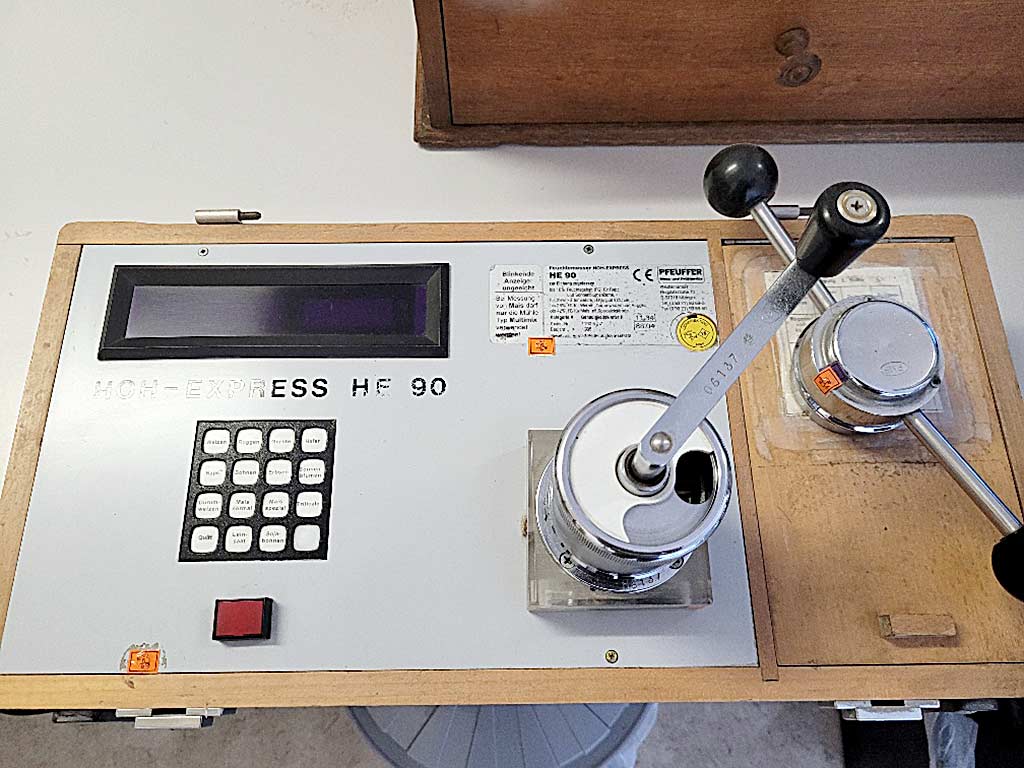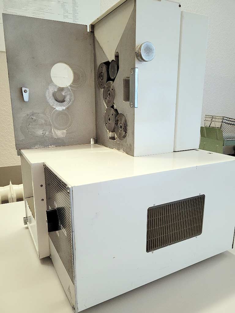 Various old but fully functional measuring and testing devices from a grain laboratory are available. 1) Falling number measuring device Perten Falling Number 1402. 2) Sample cleaner A/S Rationel Kornservice Sample Cleaner MLN, weight: approx. 60kg. 3) Laboratory mill MIM 3100. 4) Hectoliter weight Louis Schopper with scale and weights. 5) Grain moisture meter Pfeuffer HOH Express HE 90, year of manufacture: 1998, measuring time: approx. 30s. 6) Laboratory mill Perten LM 3100. 7) Laboratory oven. 8) Calibration and temperature reference bath Fluke 7320 High-Precision-Bath, temperature range: -20°C/150°C, resolution: 0.01°C, bath dimensions X/Y/Z: approx. 170mm/90mm/230mm, volume: approx. 9l. Documentation available. An on-site inspection is possible. A package sale is preferred, however individual sale is possible.